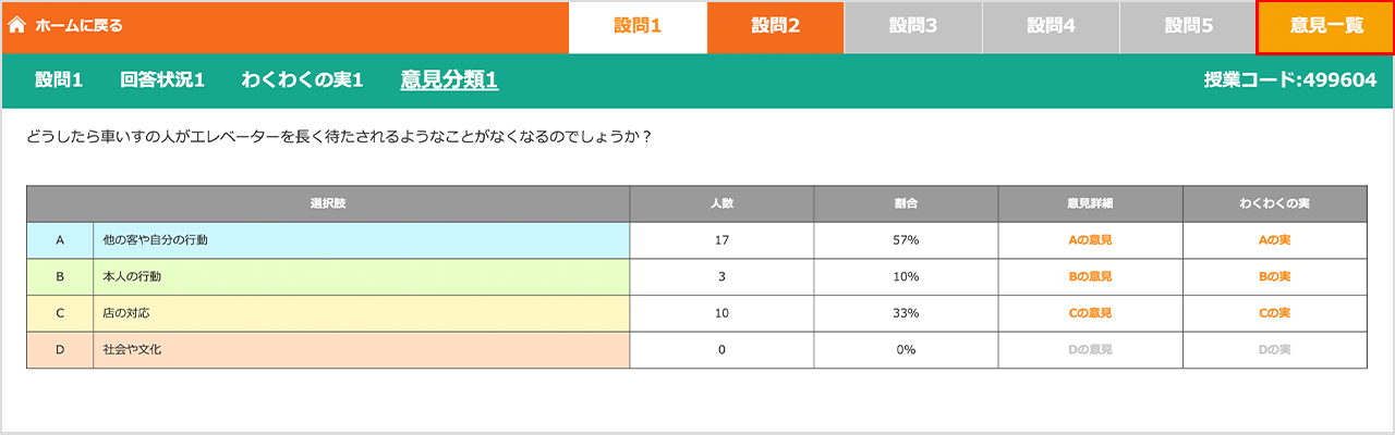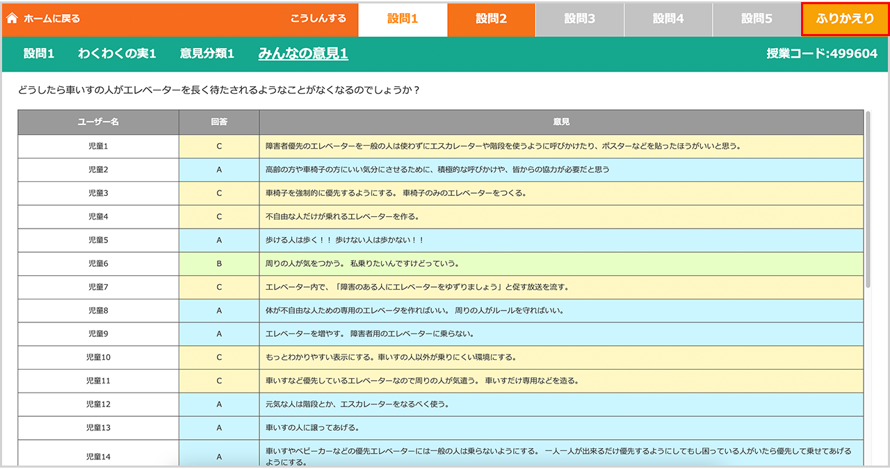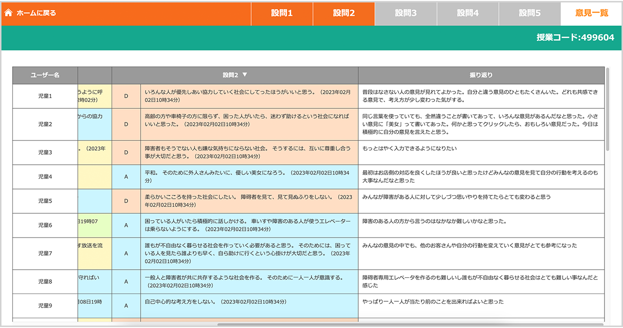 先生画面では、すべての設問に対する回答・意見・振り返りを一覧で表示します。