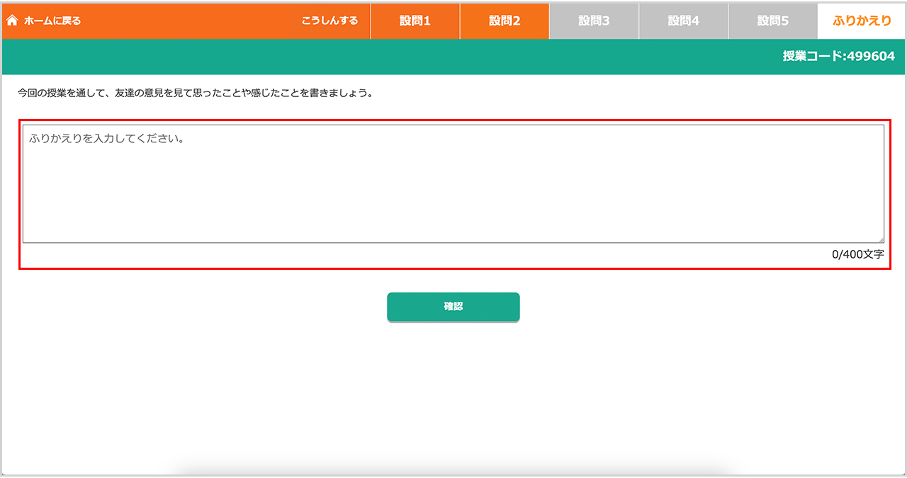②入力欄に、授業の振り返りや気づきを入力する(最大400文字)