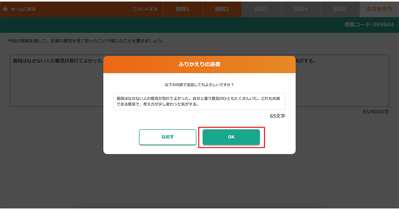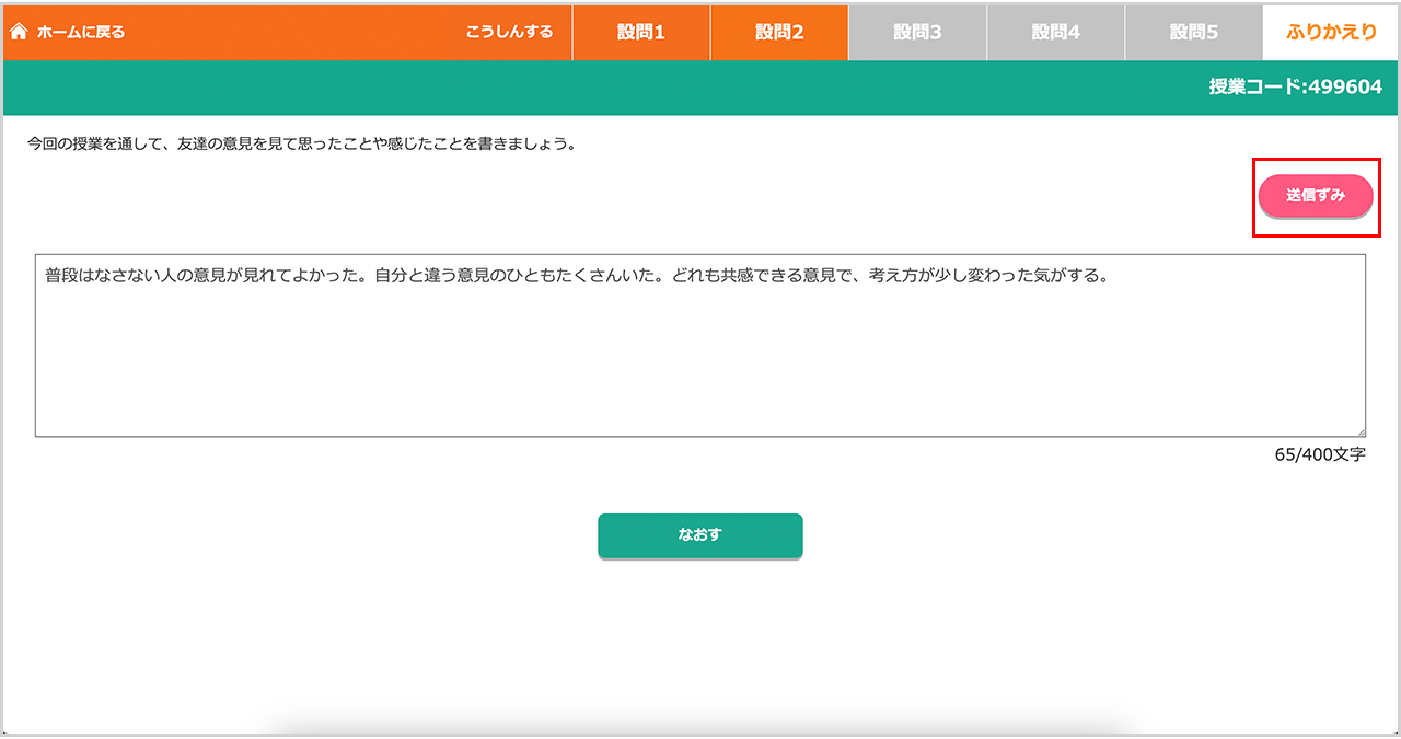 ⑤入力内容が先生に送信され、右上に「送信ずみ」マークが表示される
