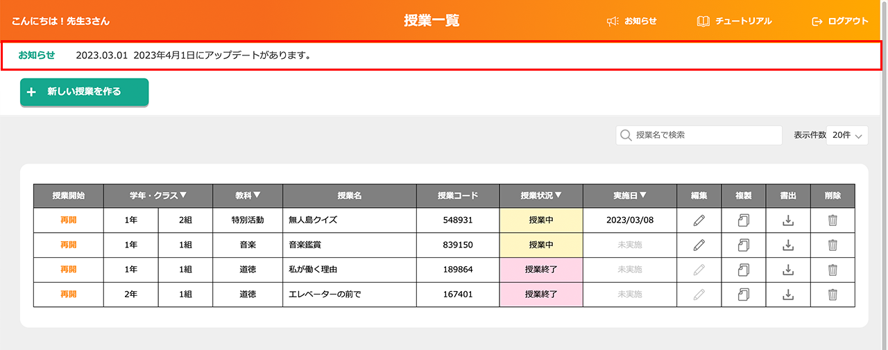 AIAIモンキー 基本機能 先生へのお知らせ 2022.08.01 2025.11.27 アプリに関するアップデートやメンテナンスなどが発生する場合は、順次ホーム画面にてお知らせしております。「お知らせ」は、ホーム画面上部のバナーで確認することができます。 ①詳しい内容を確認するときは、バナー上をタップバナーは一度クリックすると消えてしまうので、ご注意ください。 ②お知らせページが表示される ③再度お知らせを確認したい場合は、ホーム画面の「お知らせ」をタップ
