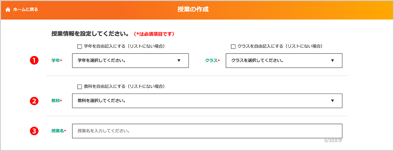 授業一覧で表示した際に、判別しやすい授業名や単元名などを入力します。(最大20文字)