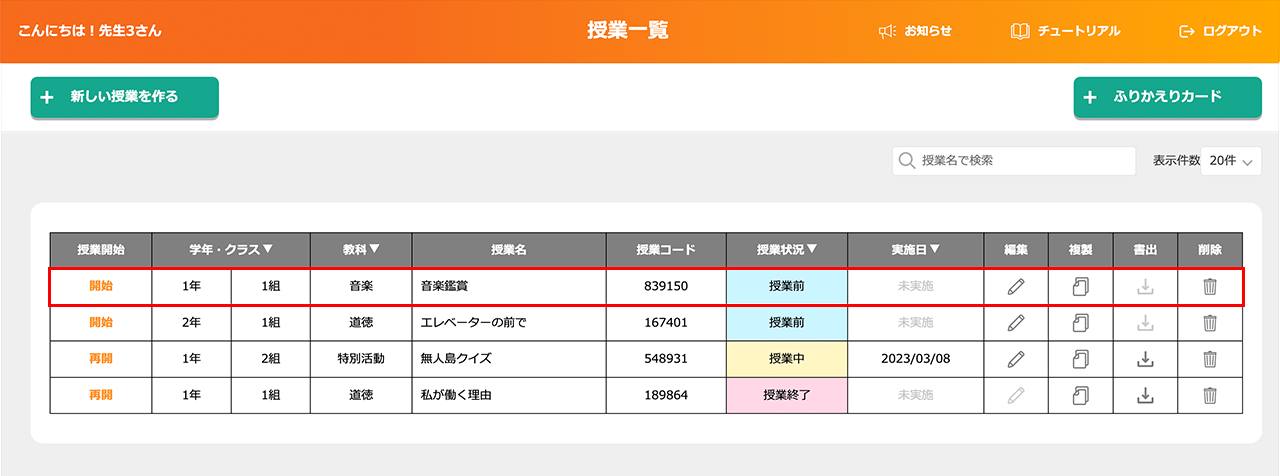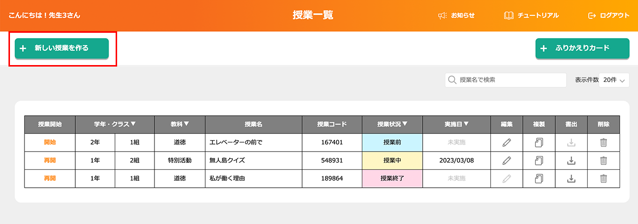 ⑦授業一覧に、いま作成した授業が追加される