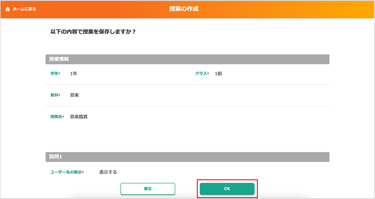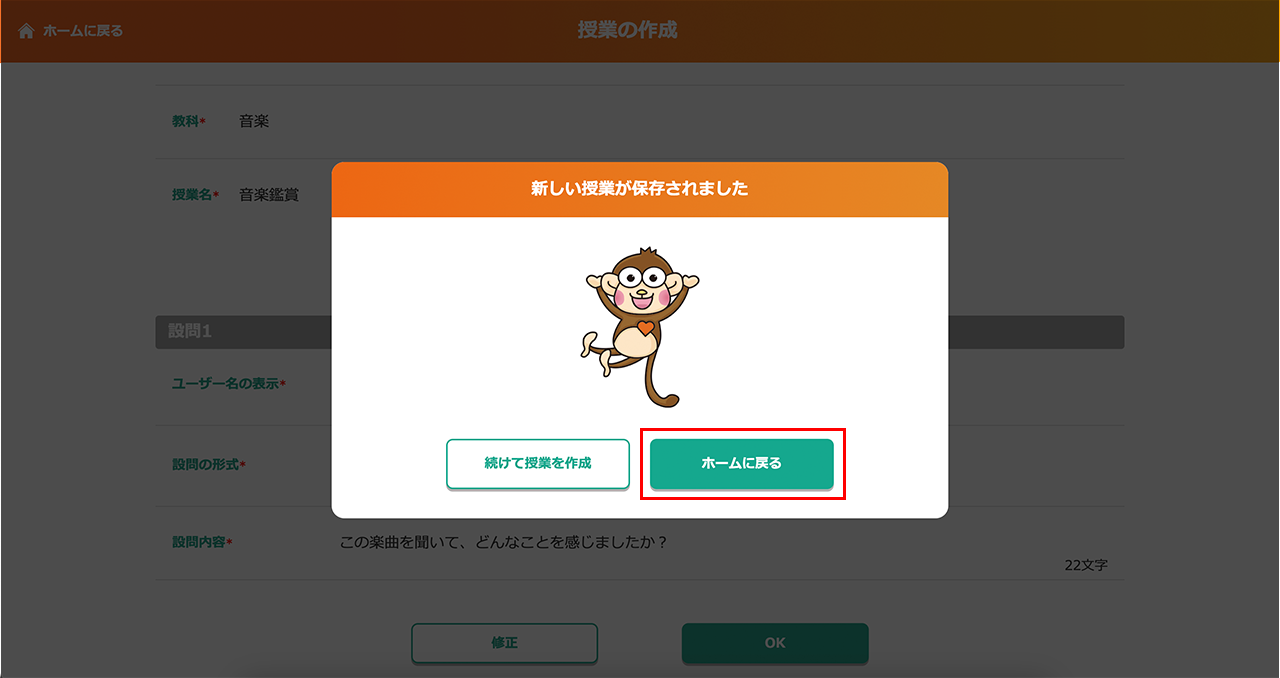 ⑥「新しい授業が保存されました」と表示されたら、「ホームに戻る」をタップ