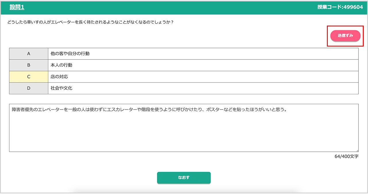 ⑤入力内容が先生に送信され、「送信ずみ」マークが表示される