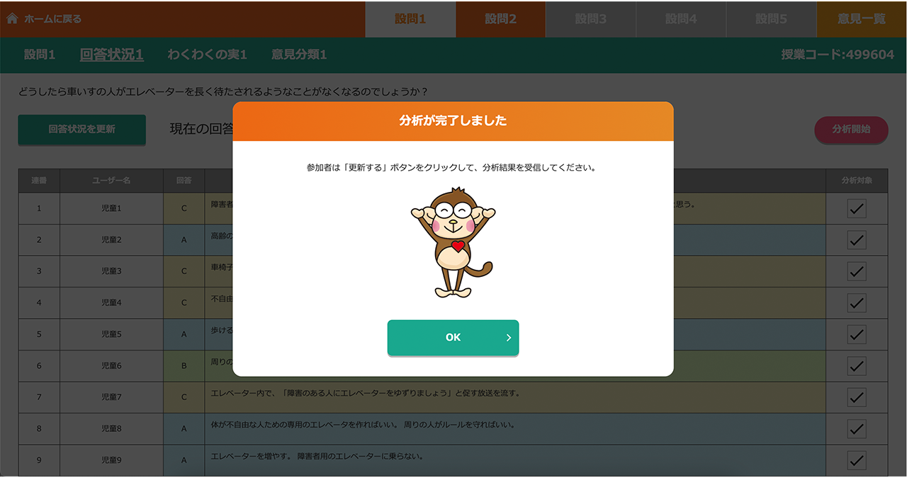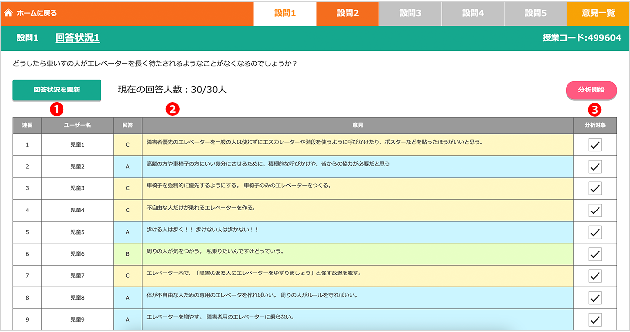 子どもたちの意見を受信したら、先生のタイミングで意見を分析することができます。