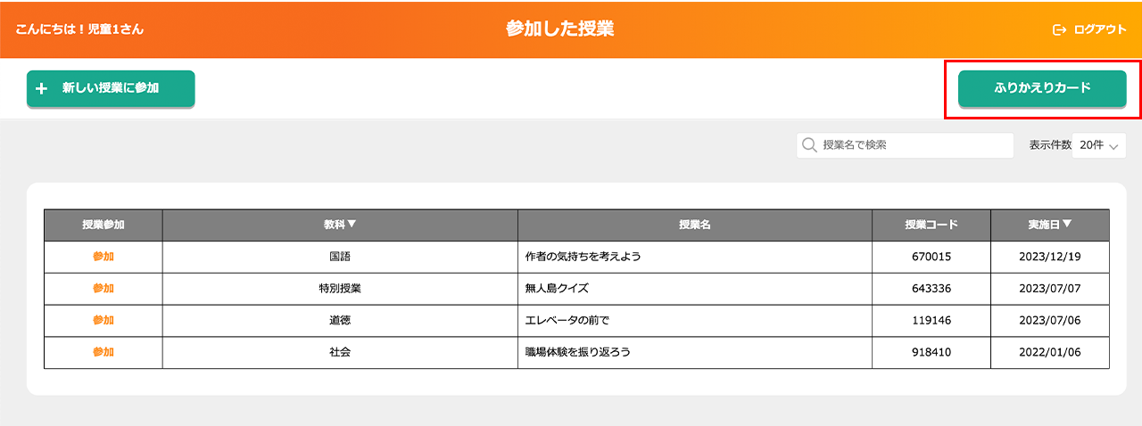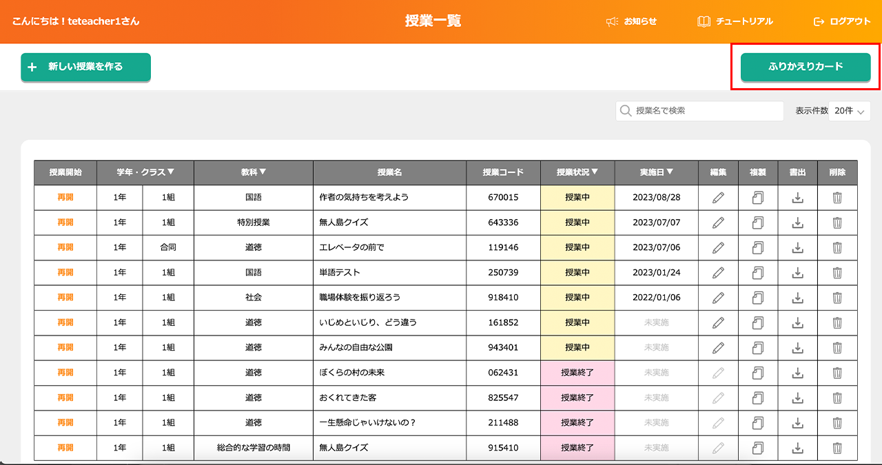 対象児童生徒が参加した授業の振り返りを一覧で表示します。「実施日」「教科」「授業名」でソートすることができます。