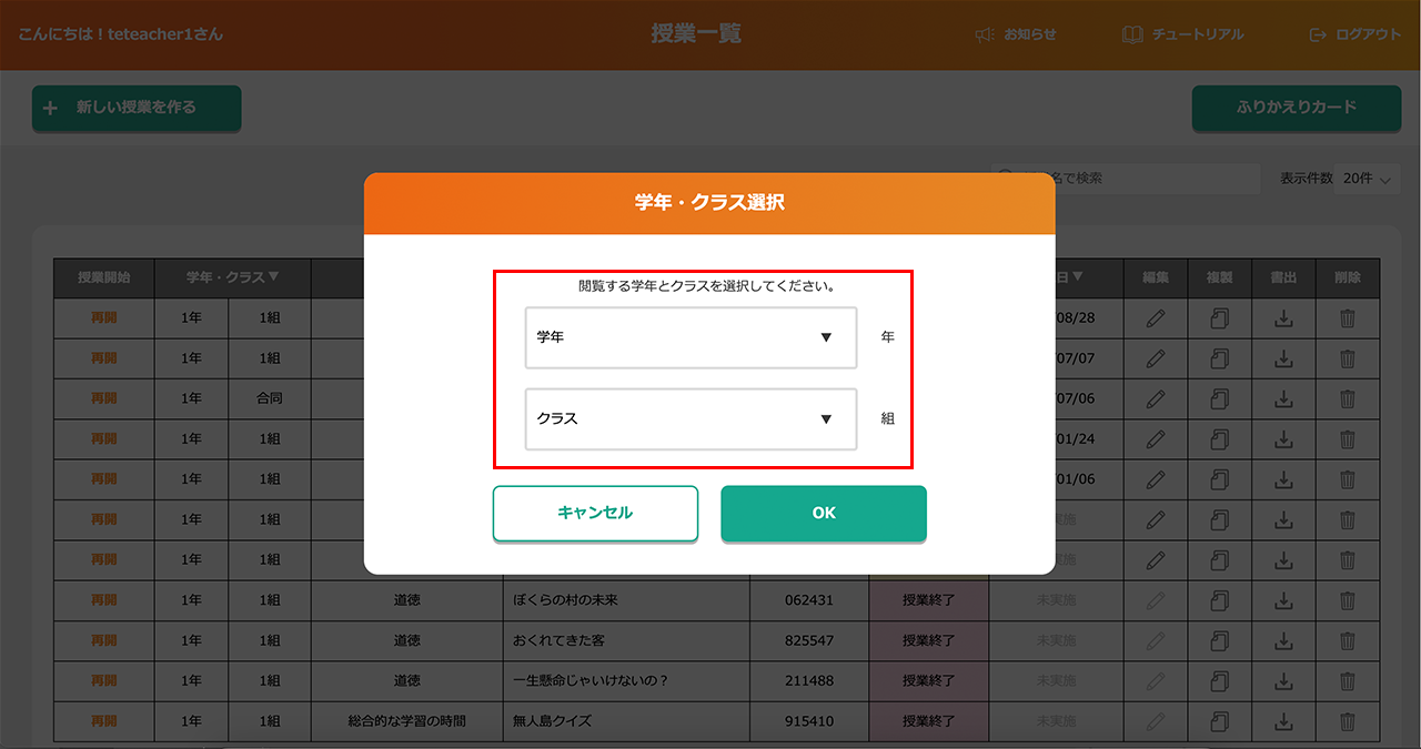 ②学年・クラス選択ポップアップが表示されたら、学年とクラスを選択し、「OK」をタップ