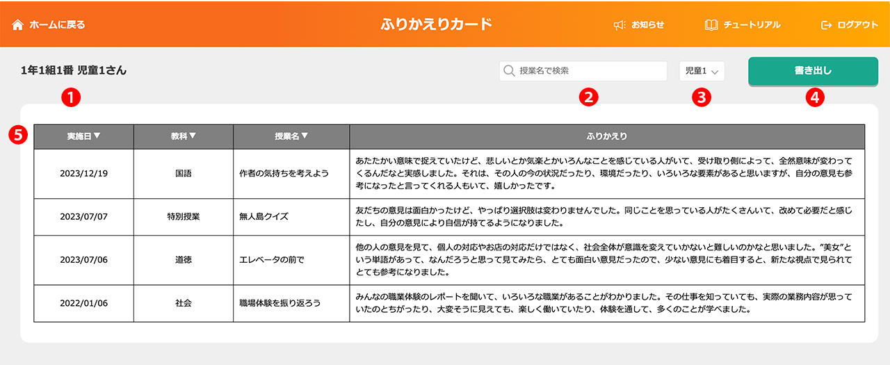 実施した授業の振り返りは、児童生徒ごとに一覧で確認することができます。