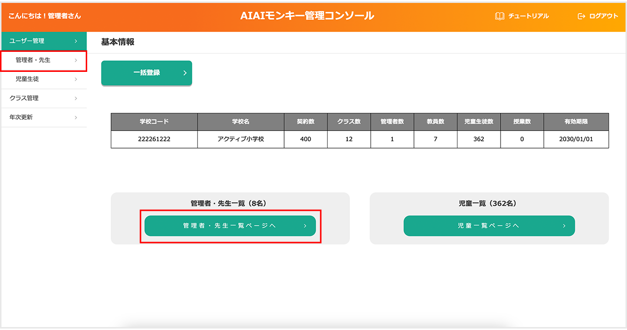 ①「管理者・先生一覧ページへ」ボタン、または左サブメニュー「管理者・先生」をタップ