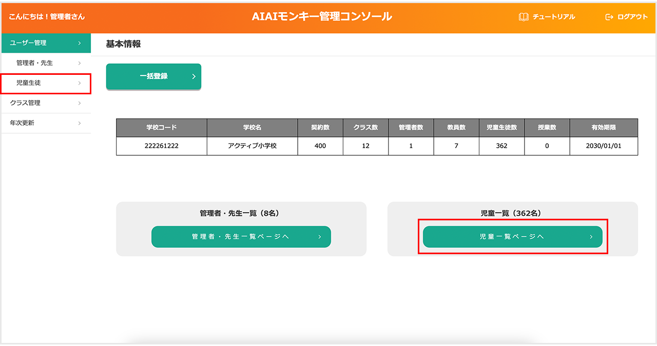①「児童(生徒)一覧ページへ」ボタン、または左サブメニュー「児童生徒」をタップ