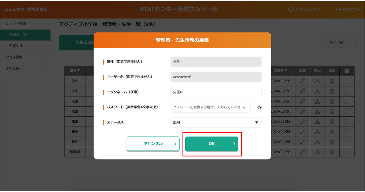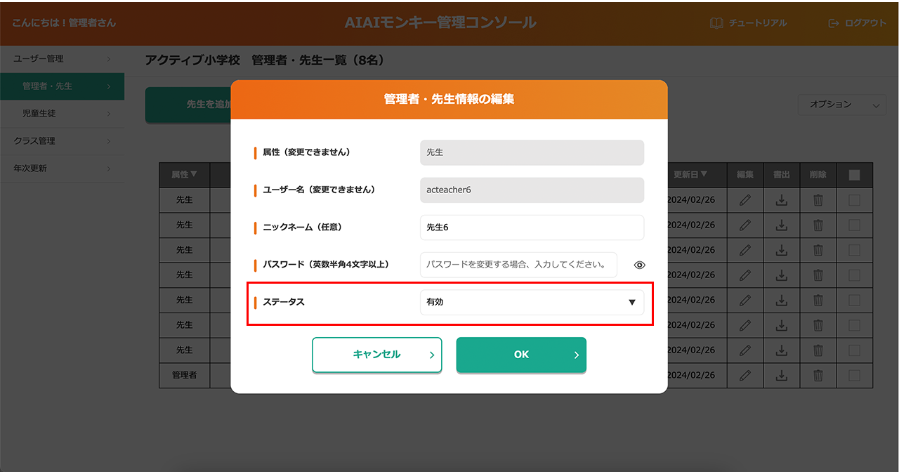 ③「管理者・先生情報の編集」画面が表示されたら、「ステータス」を「有効」から「無効」にする