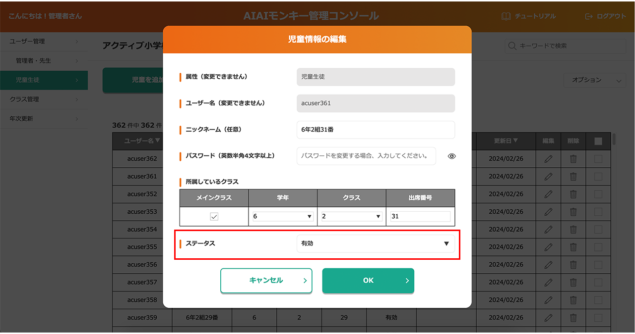 ③「児童(生徒)情報の編集」画面が表示されたら、「ステータス」を「有効」から「無効」にする