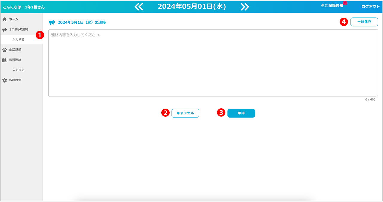 ①「連絡入力」画面が表示されたら、以下の項目を入力します。