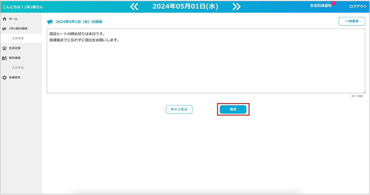 入力した内容は、先生のホーム画面に反映され、対象のクラスの生徒全員に送信されます。