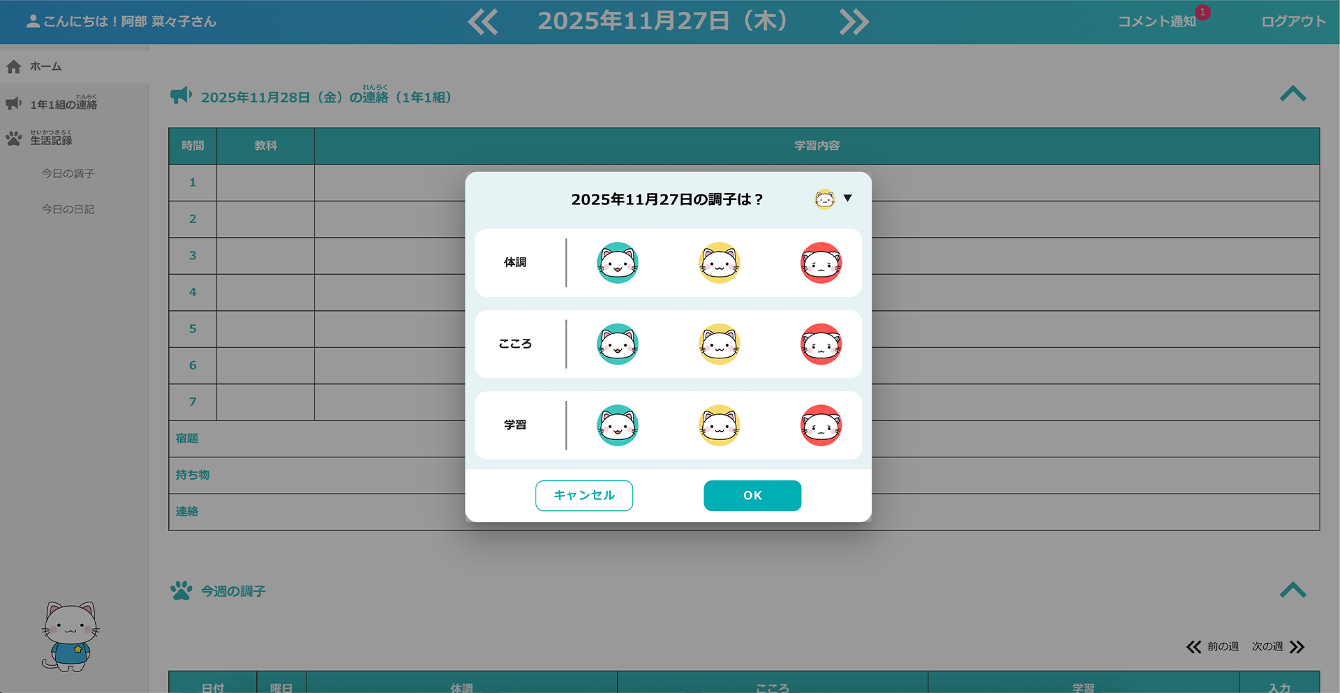 児童生徒がふぅーにゃんの記録簿を起動すると、デフォルトでは「今日の調子」入力画面が自動表示されます。