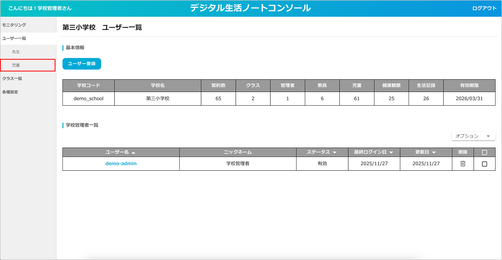 ② 登録されている「児童生徒」一覧を確認することができます。