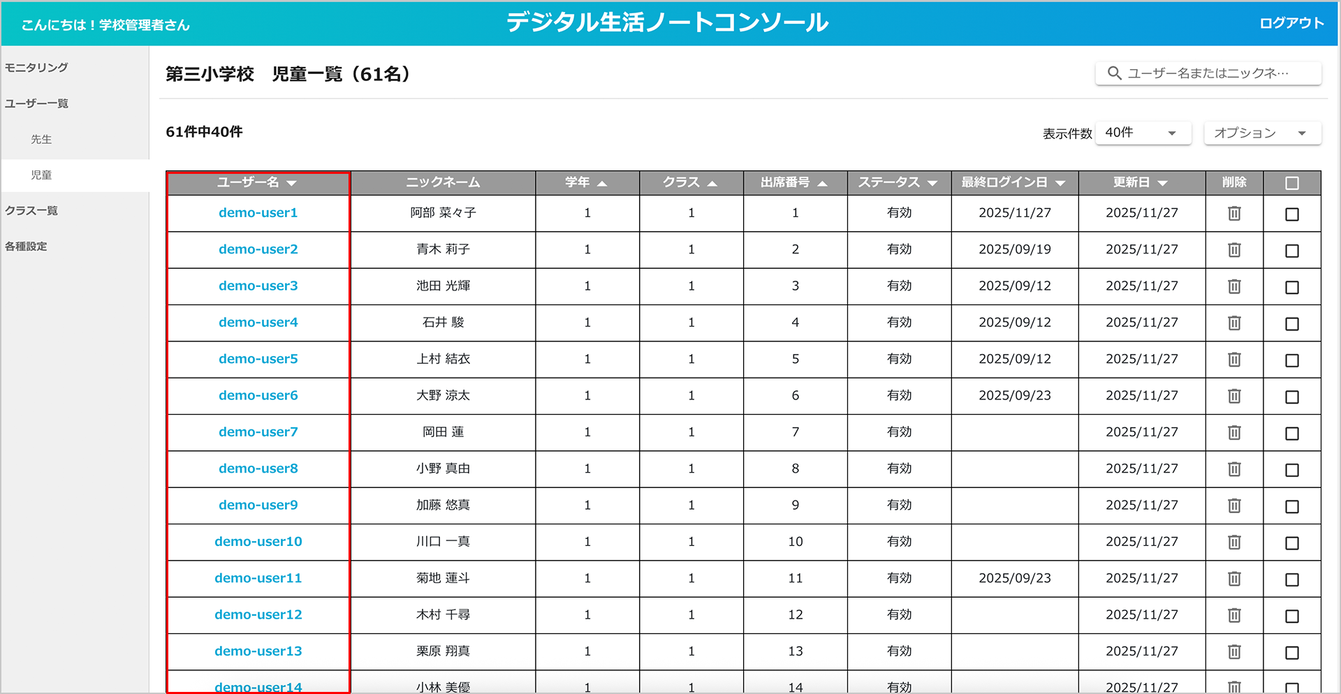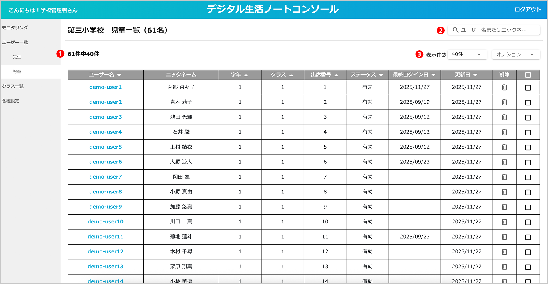 登録されている全児童生徒のうち、現在一覧に表示されている人数が表示されます。