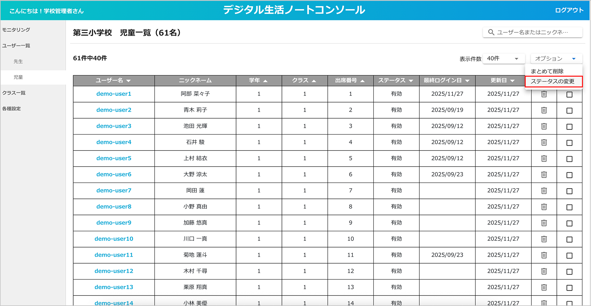 ステータスの変更は、「オプション」ボタンの「ステータスの変更」から複数のユーザーをまとめて変更することもできます。