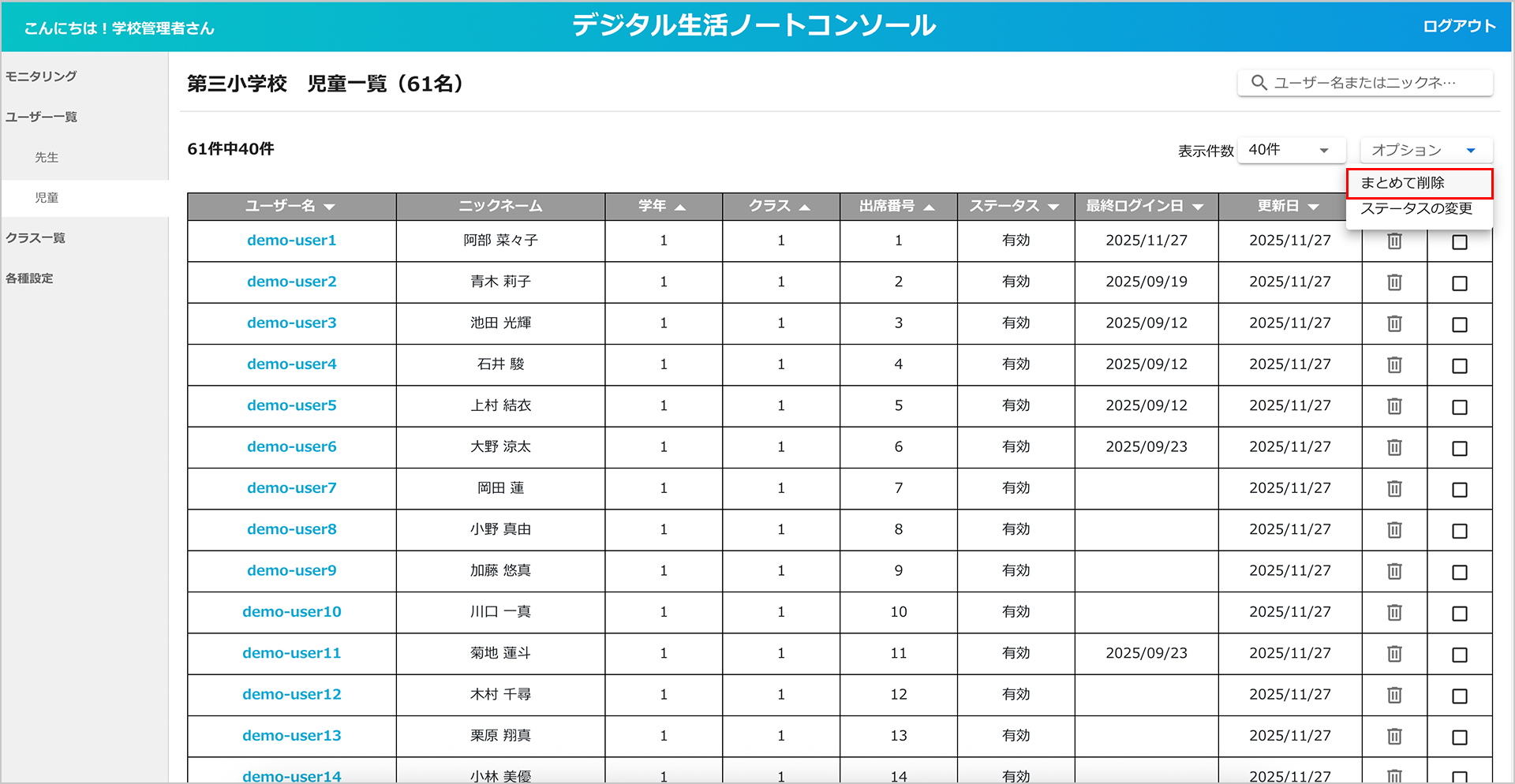「オプション」ボタンの「まとめて削除」から複数のユーザーをまとめて削除することもできます。