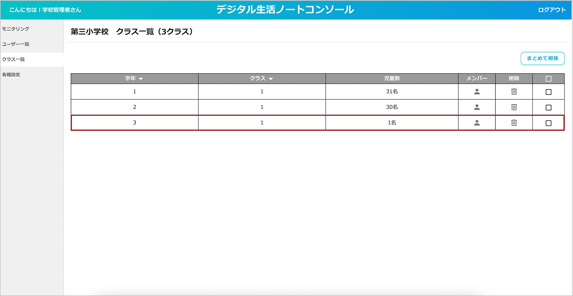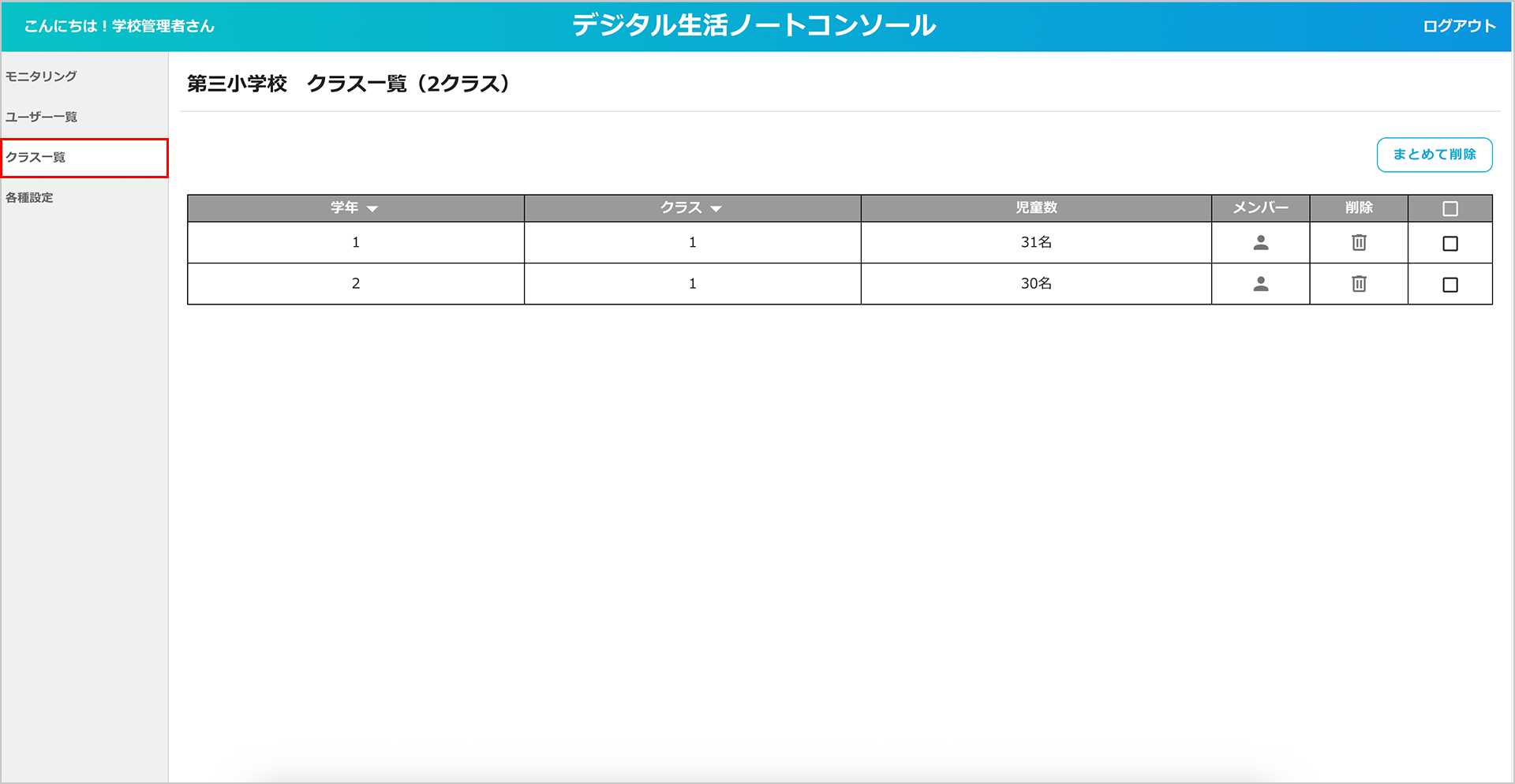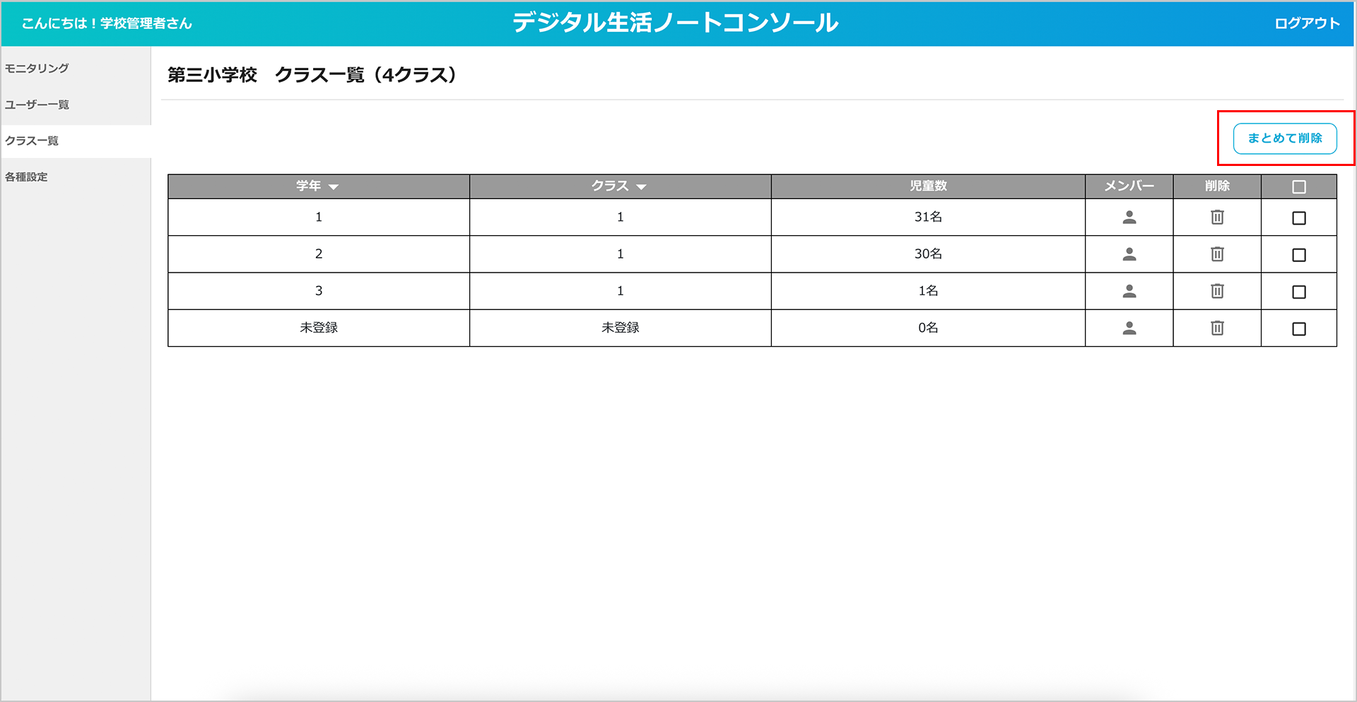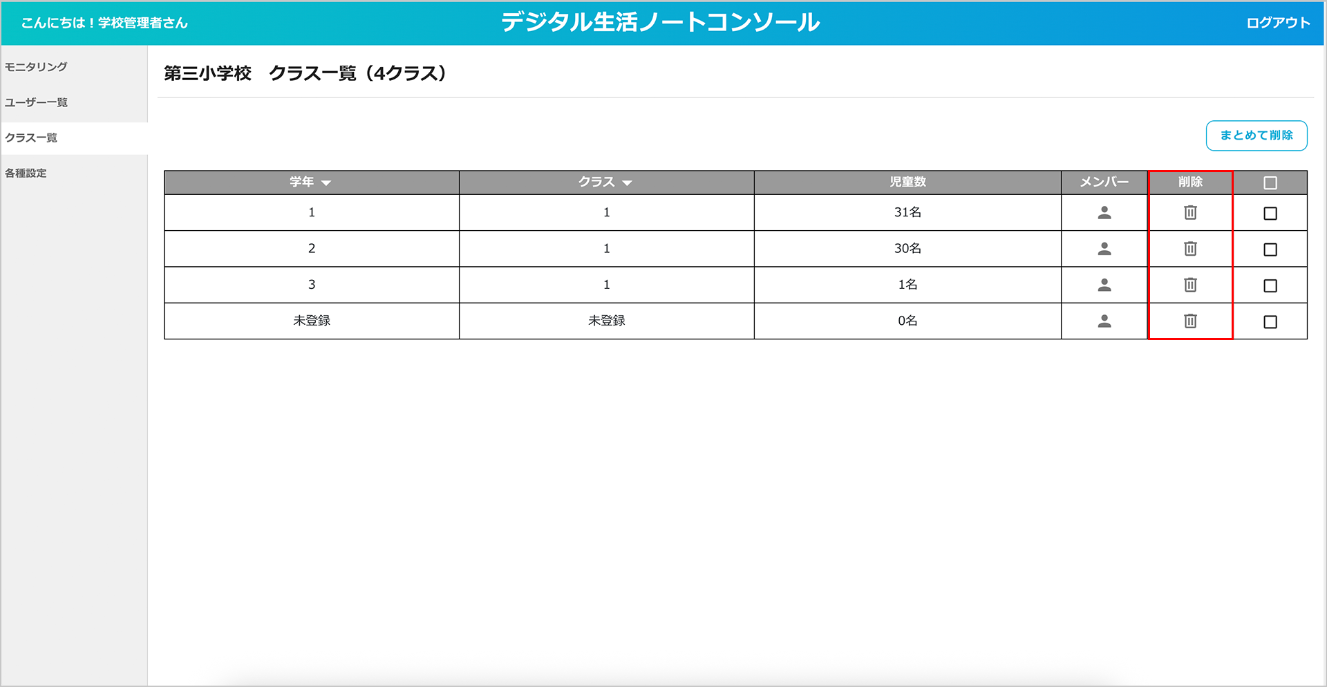 「まとめて削除」ボタンから複数のクラスをまとめて削除することもできます。