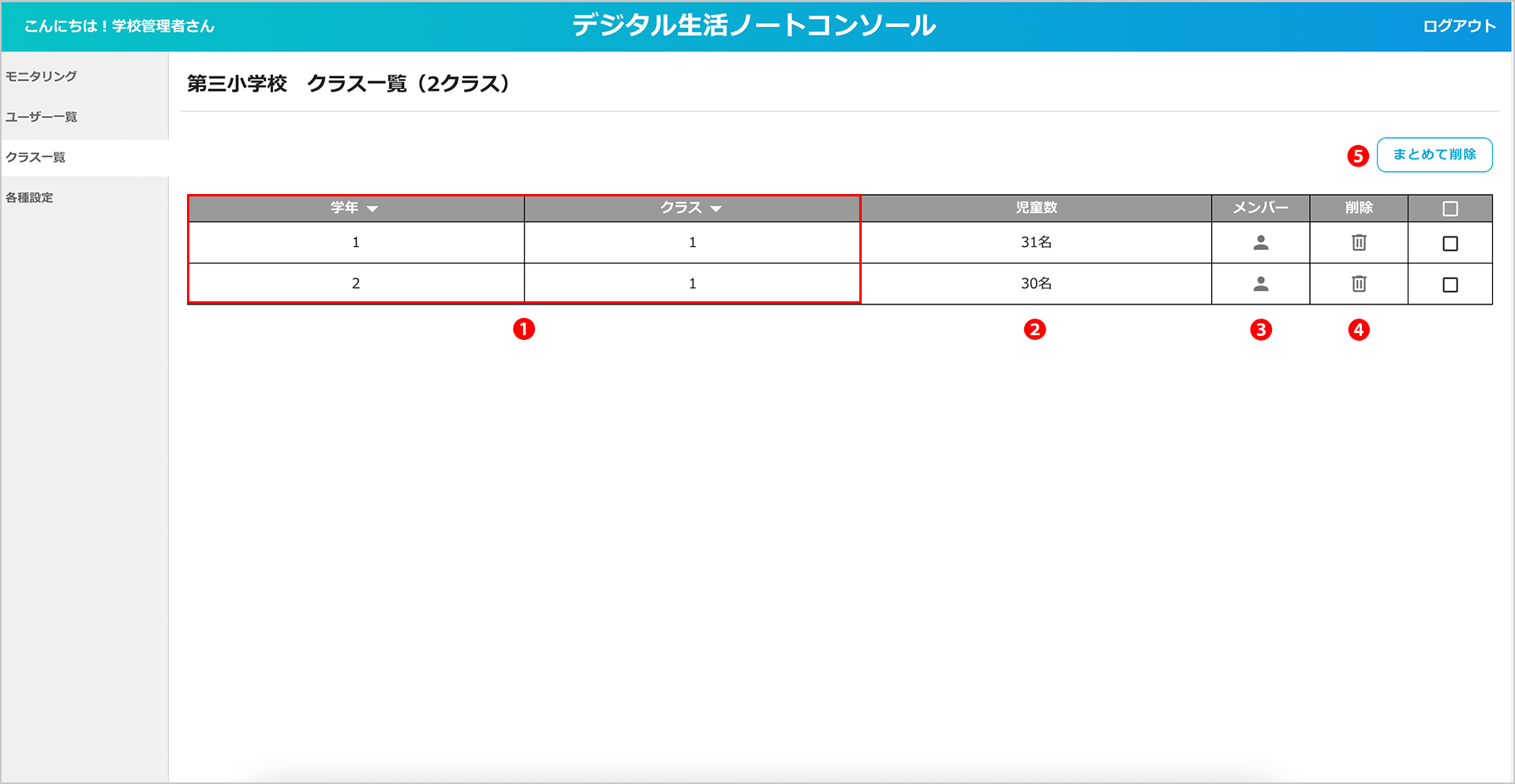 ① 学校に登録されているクラスの情報を確認する場合は、サブメニュー「クラス一覧」をクリックします。