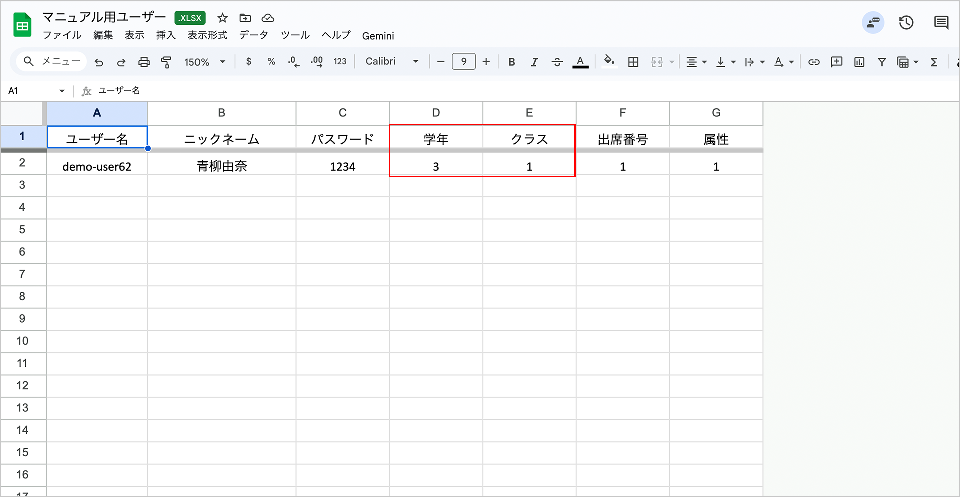 ① 登録用 CSV ファイルに、新しく追加したいクラス名と、そのクラスに新規登録するユーザー情報を入力し、CSV 形式で保存します。