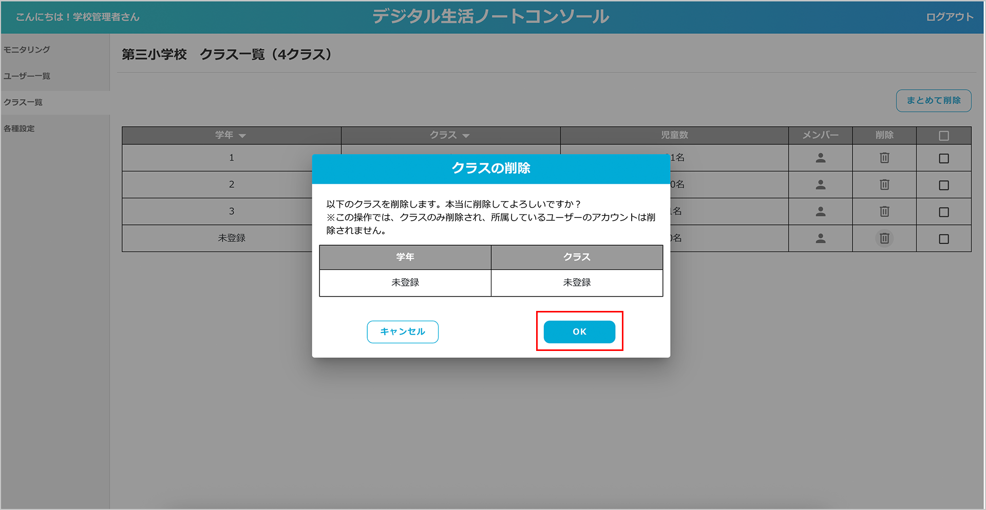 ② 「クラスの削除」ポップアップが表示されたら、内容を確認して「OK」ボタンをクリックします。