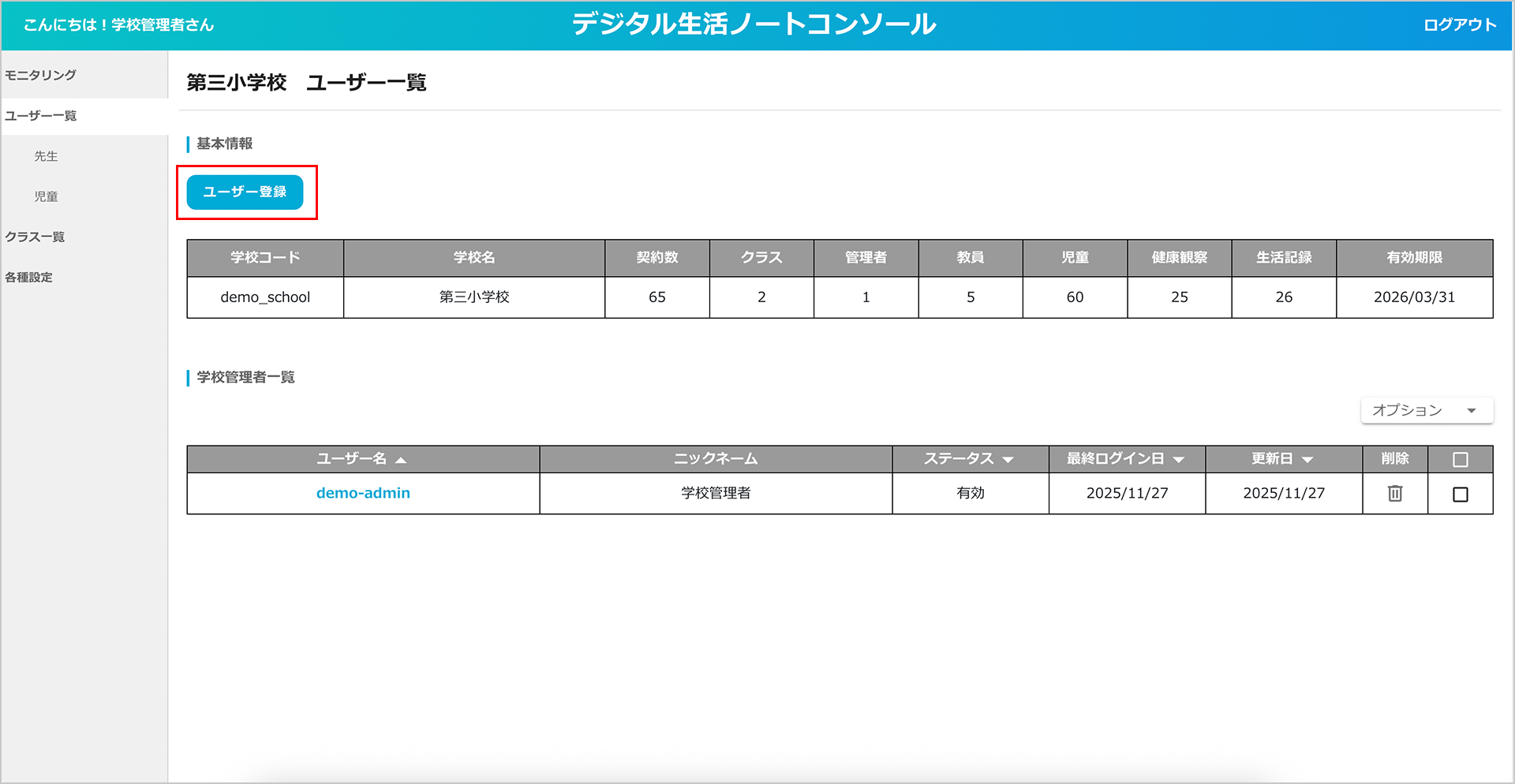 ③ ユーザー登録が完了すると、「クラス一覧」に新しいクラスが表示されます。
