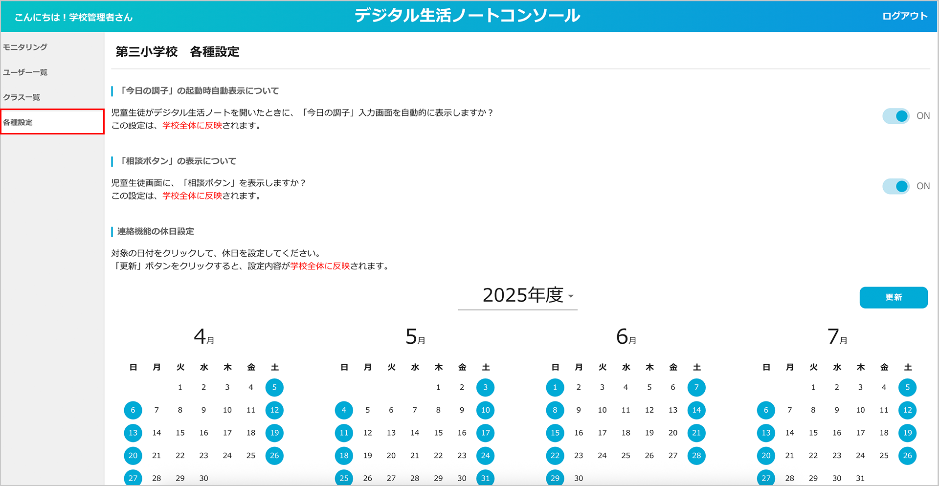 設定は学校全体に反映されます。