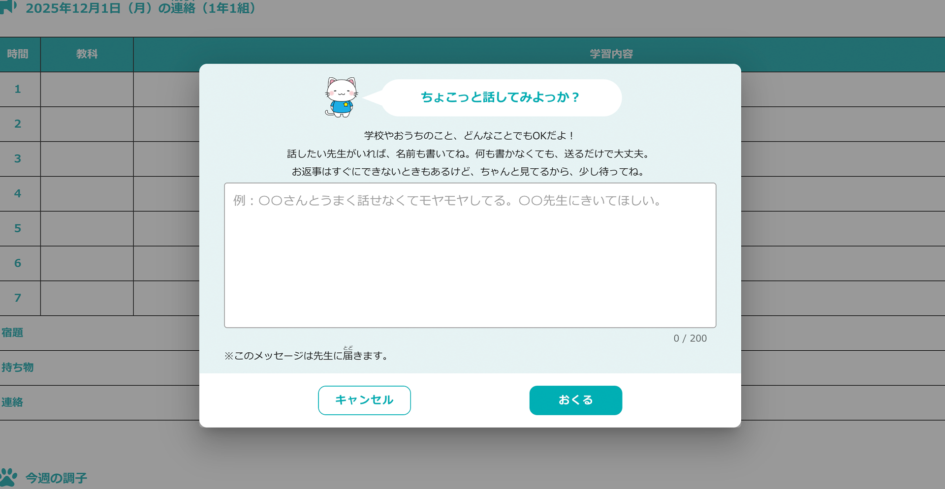 児童生徒が、悩みや不安を感じたときに、任意のタイミングで先生へ相談の気持ちを伝えられる「相談ボタン」を表示することができます。