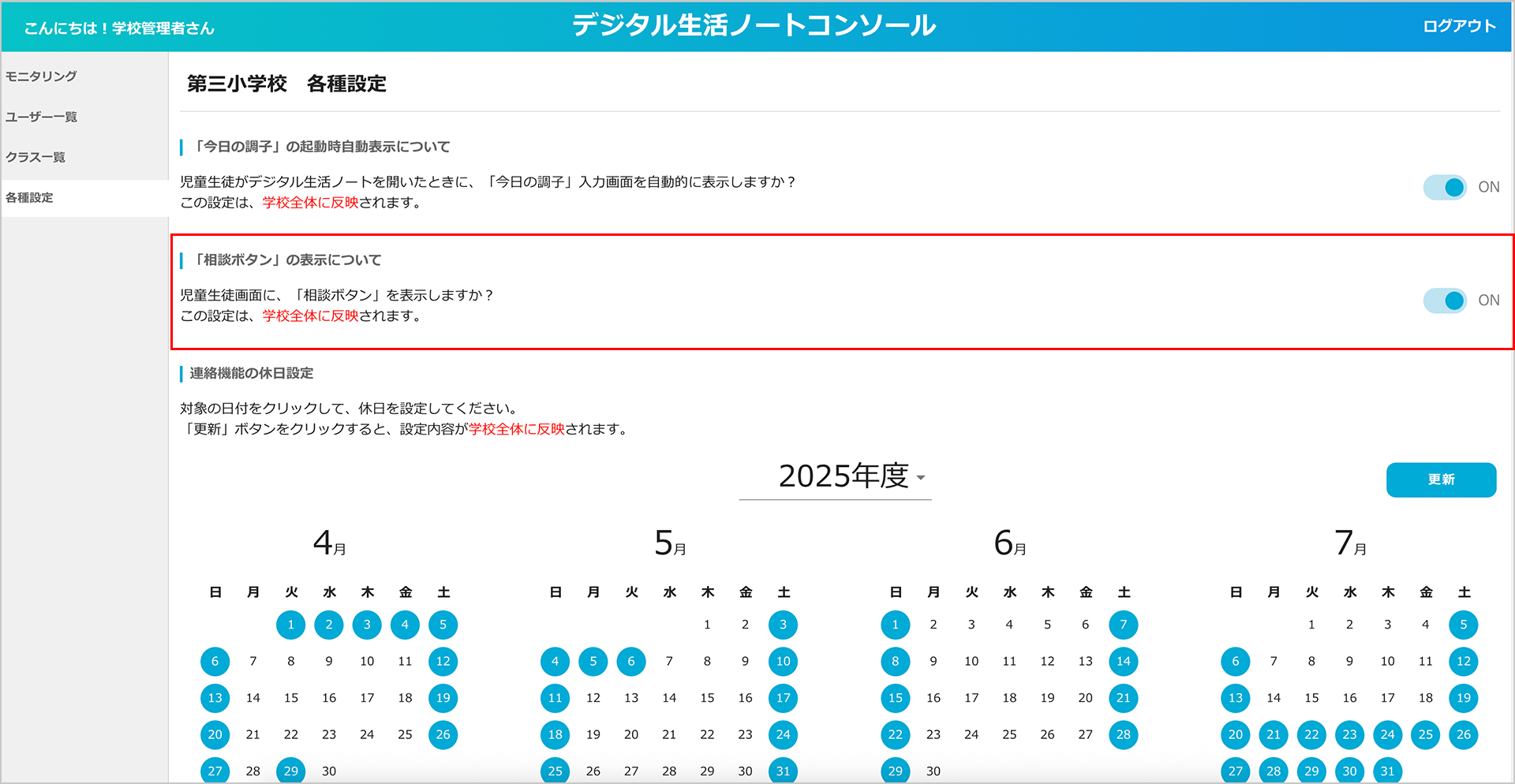 相談ボタンは 初期設定では OFF になっていますが、学校管理者は必要に応じて 表示を ON/OFF で切り替えることができます。