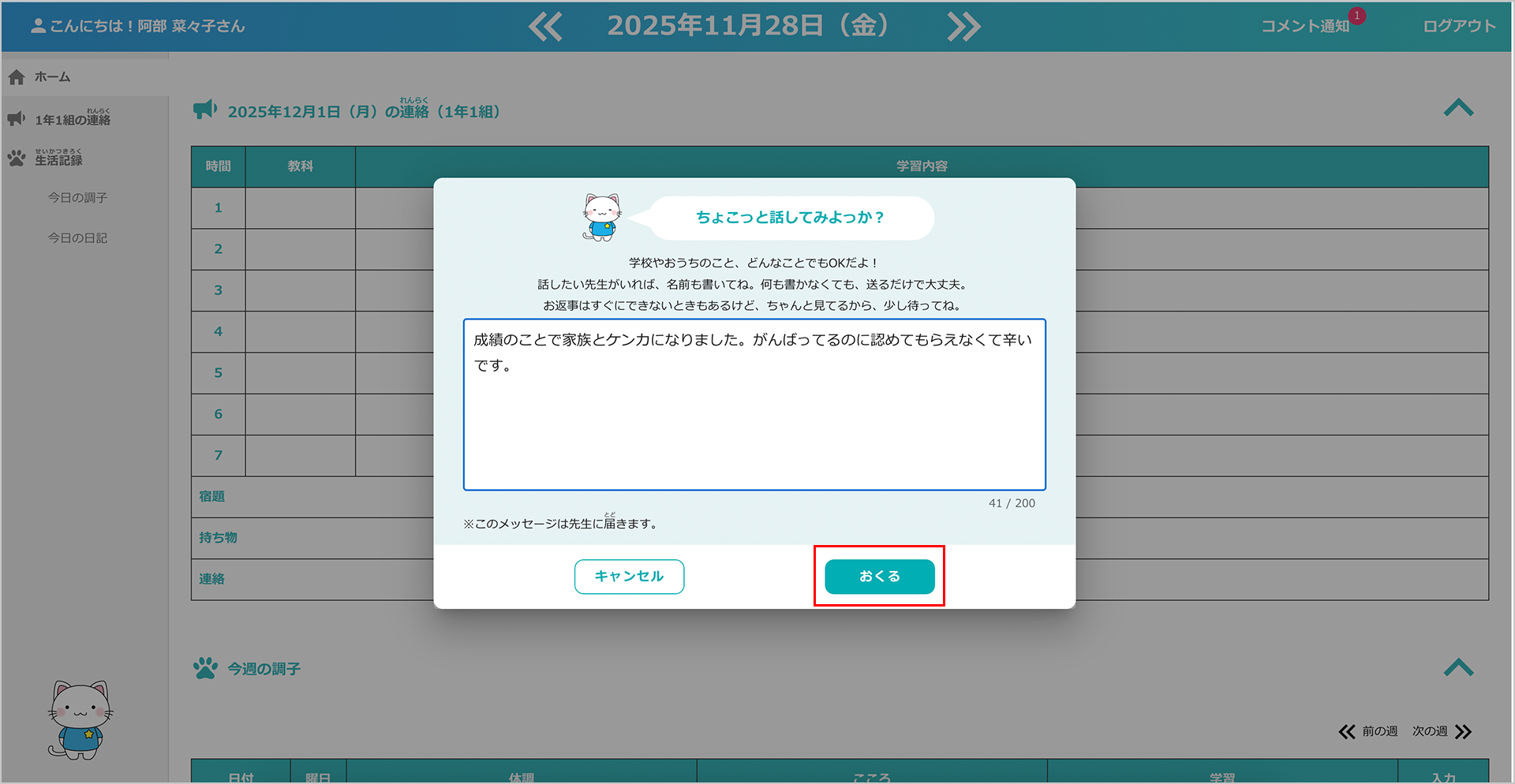 クリックすると相談内容が先生へ送信され、ポップアップが閉じます。