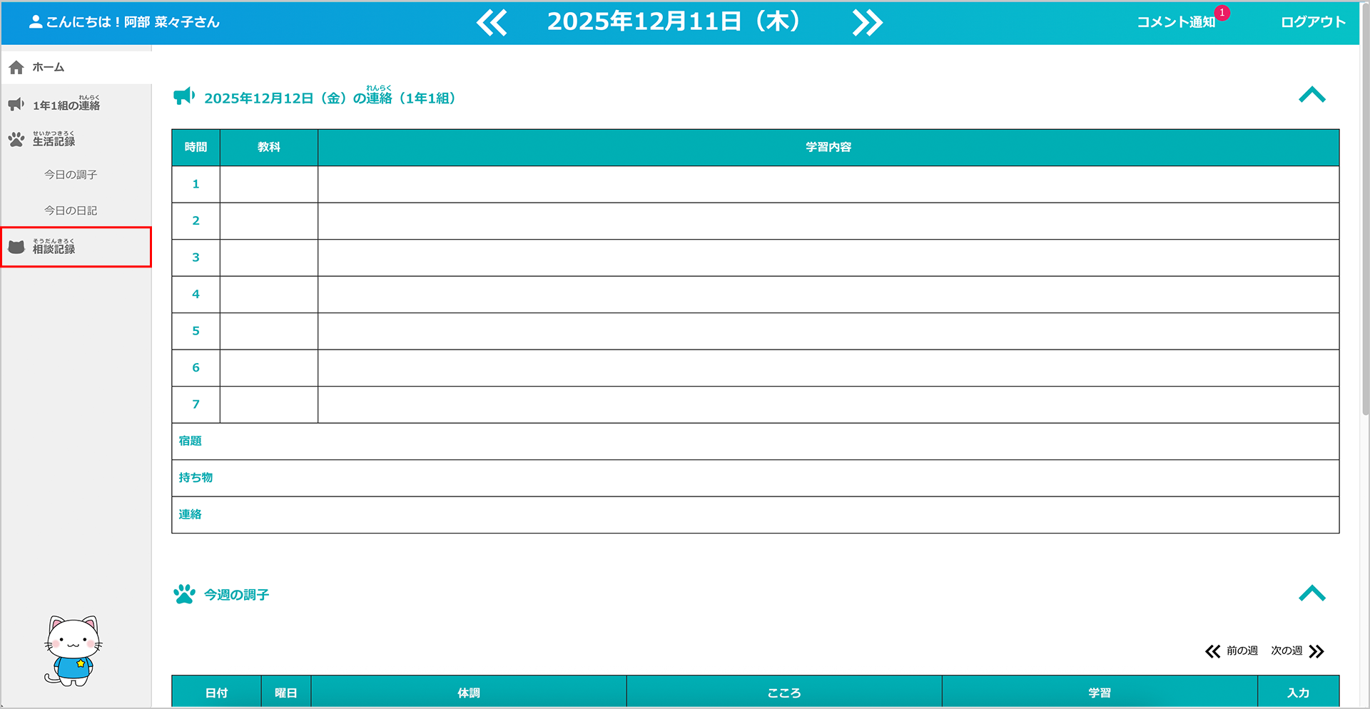 ① 送信した相談を確認したいときは、サブメニュー「相談記録」をクリックします。