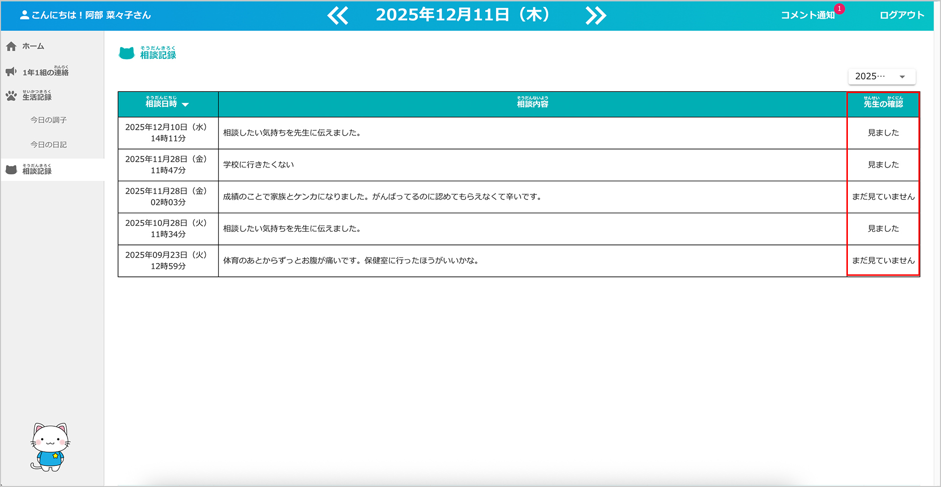 「先生の確認」欄では、先生の閲覧状況(未読/既読)も確認できます。