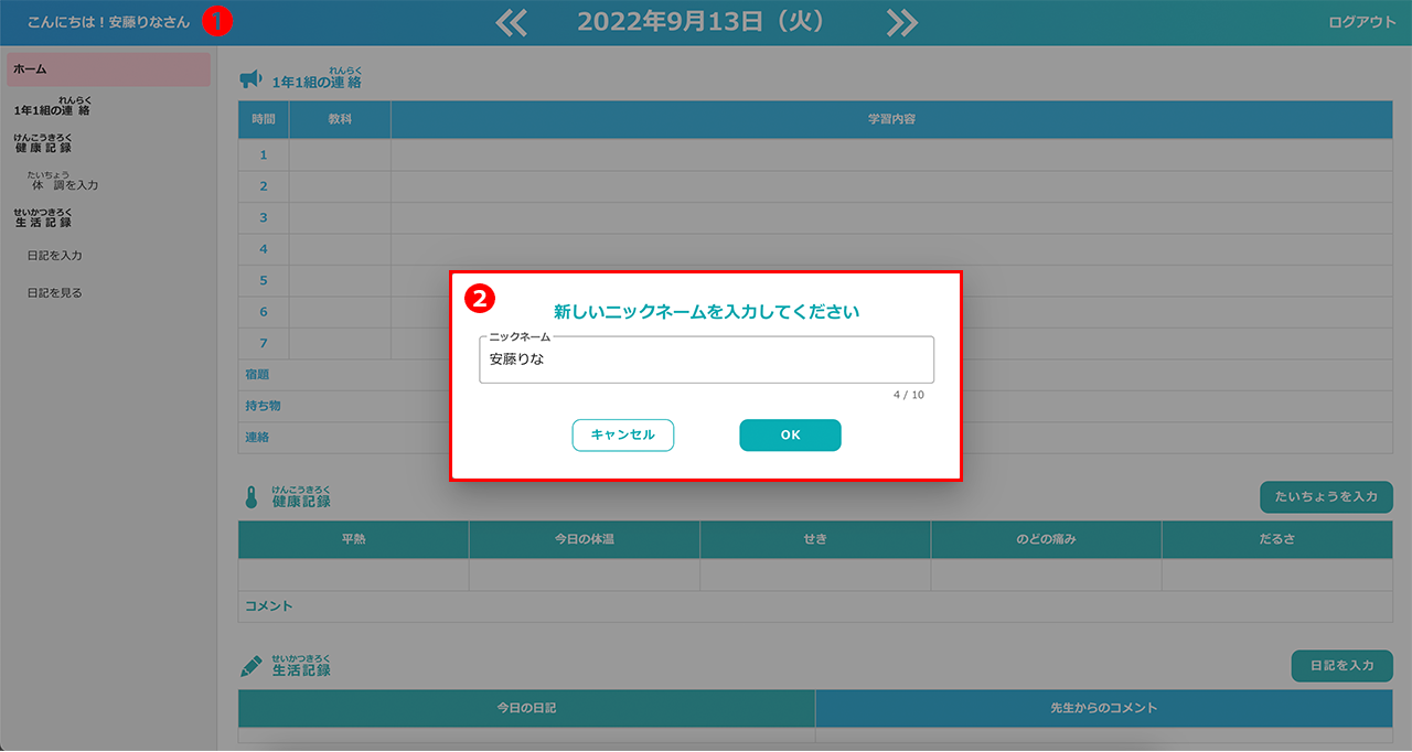 児童生徒のホーム画面から、任意のニックネームに変更することができます。
