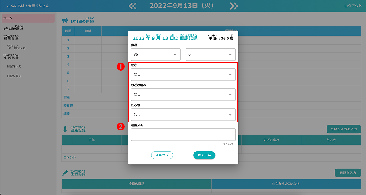 児童生徒画面では、健康記録入力画面にて、体調に関する質問のほか、自由に入力できる連絡メモ機能を追加いたしました。