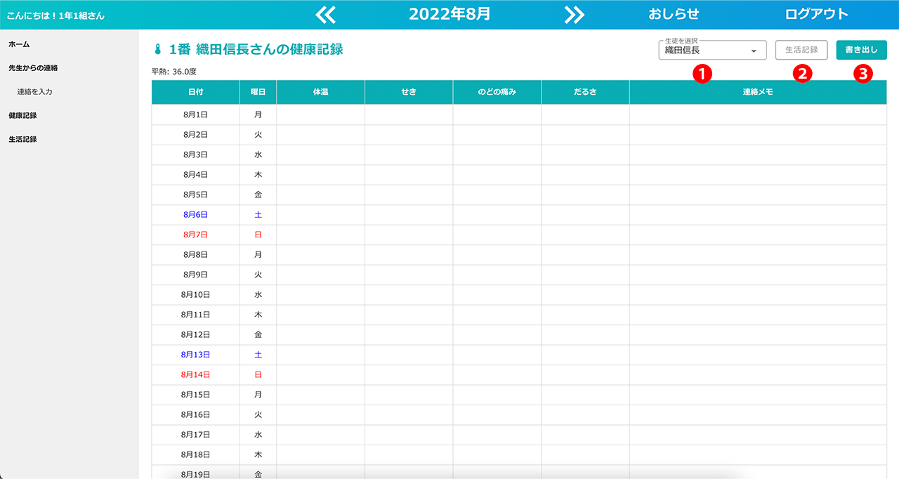 クラスごとに、平熱、体温、体調に関する質問、連絡メモを一覧で確認することができます。