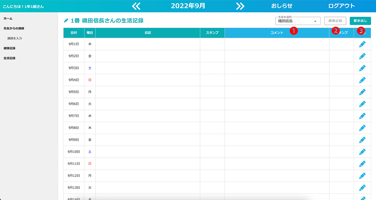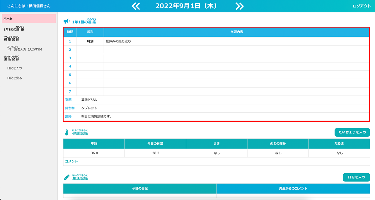 「先生からの連絡」の項目に、「時間割」「宿題」「持ち物」を記入できる項目を追加しました。