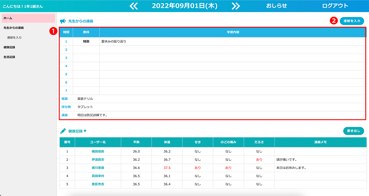 先生画面では、ホーム画面にて、クラス一覧で健康記録(体温・体調に関する質問・連絡メモ)を確認することができます。