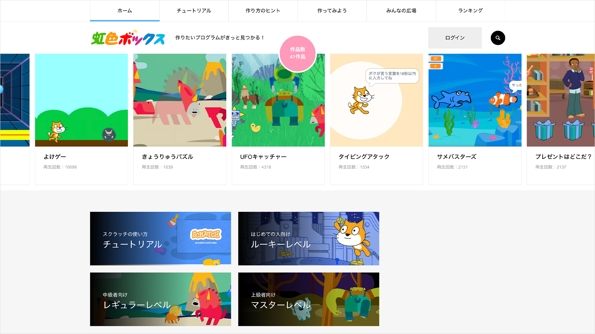 虹色ボックスでは、Scratchの操作方法や各ブロックの使い方、さまざまなプログラムの作り方を段階的に学ぶことができます。