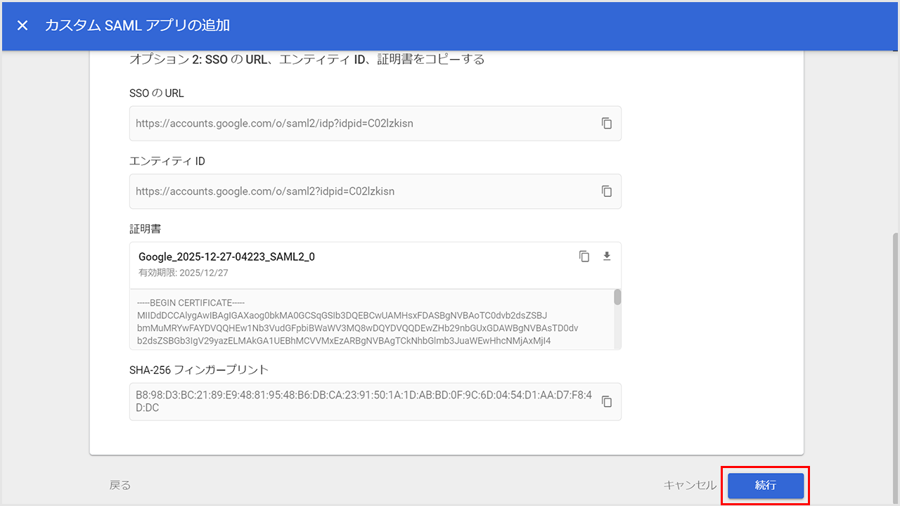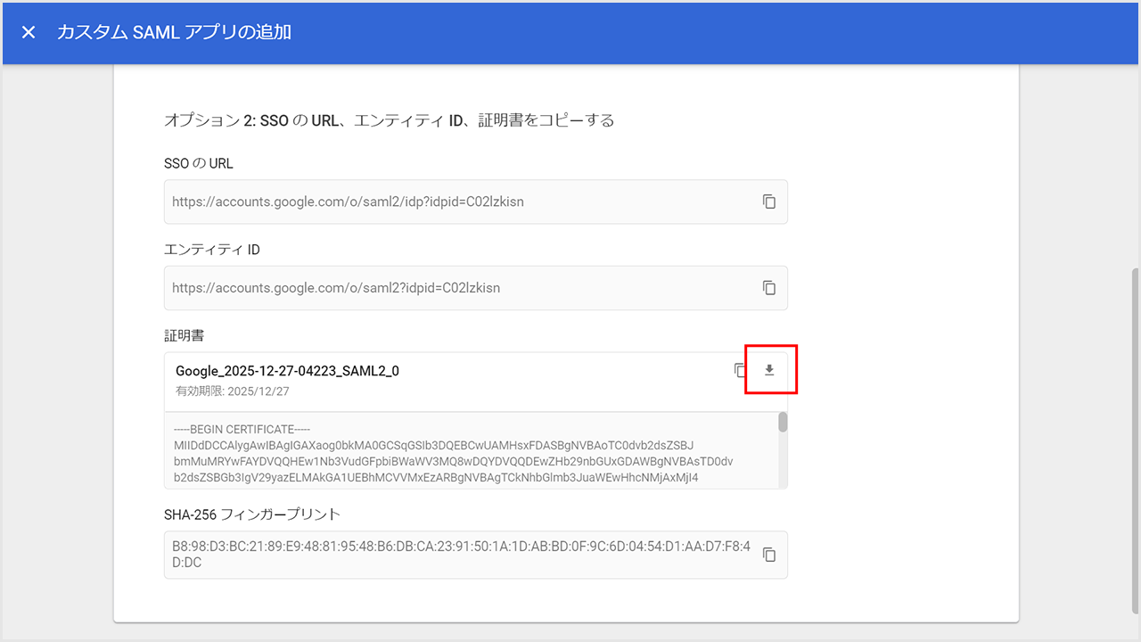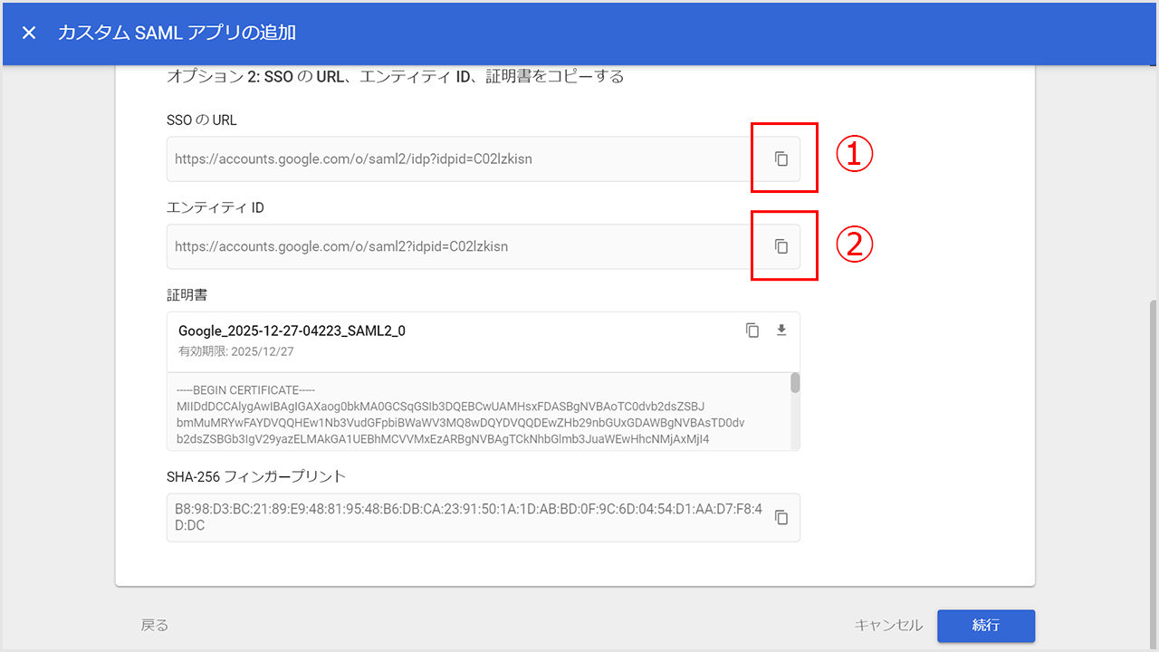 ①コピーマークをクリックして、「SSOのURL」と「エンティティID」の値をコピーします。