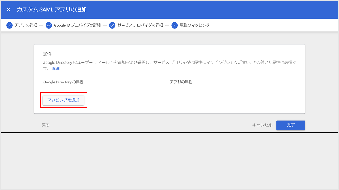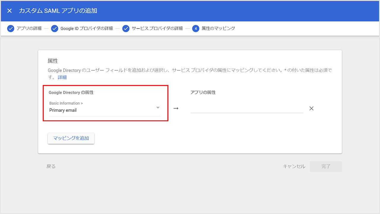 「属性のマッピング」画面が表示されたら、以下の設定を行います。