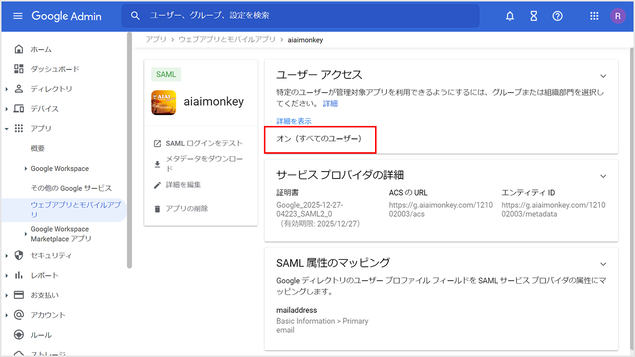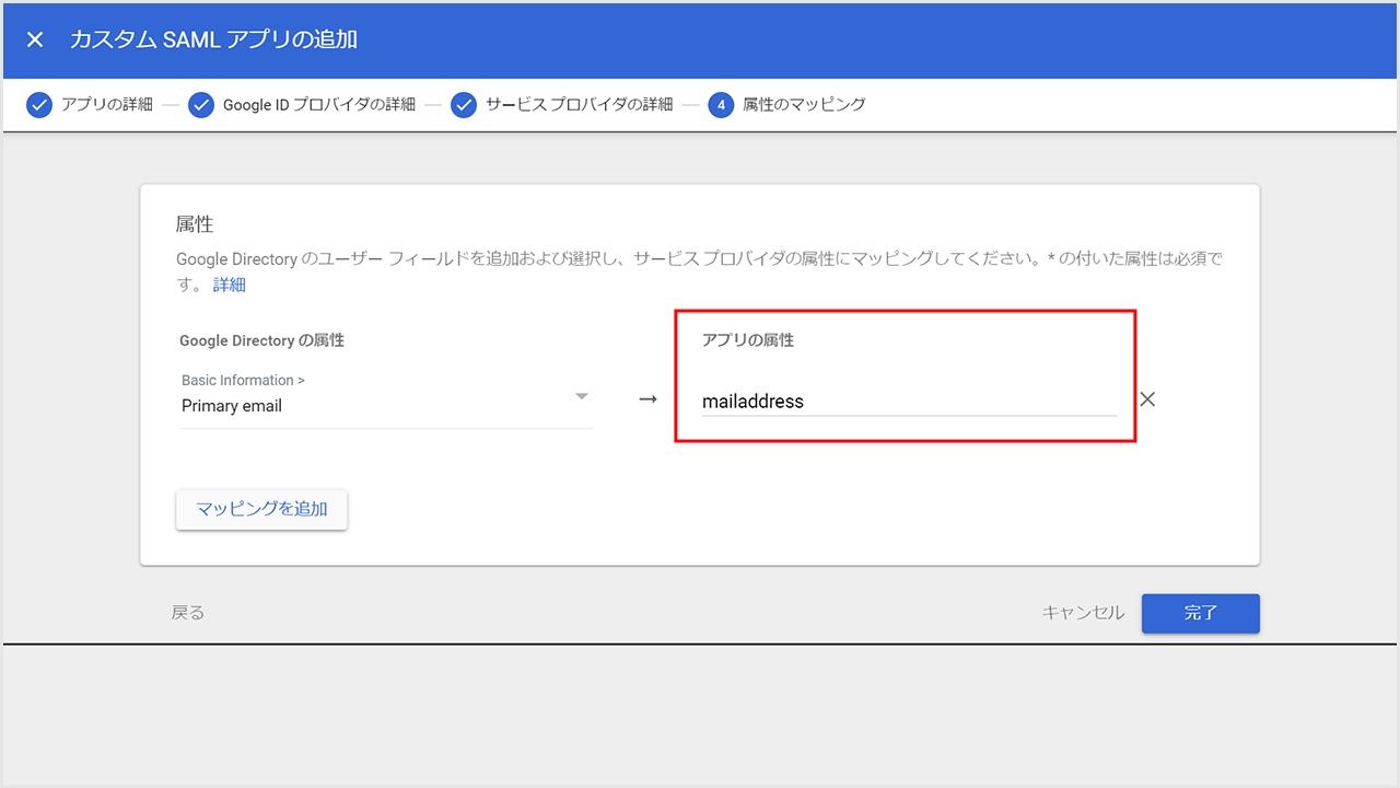 ④「アプリの属性」に、「mailaddress」を貼り付けます。