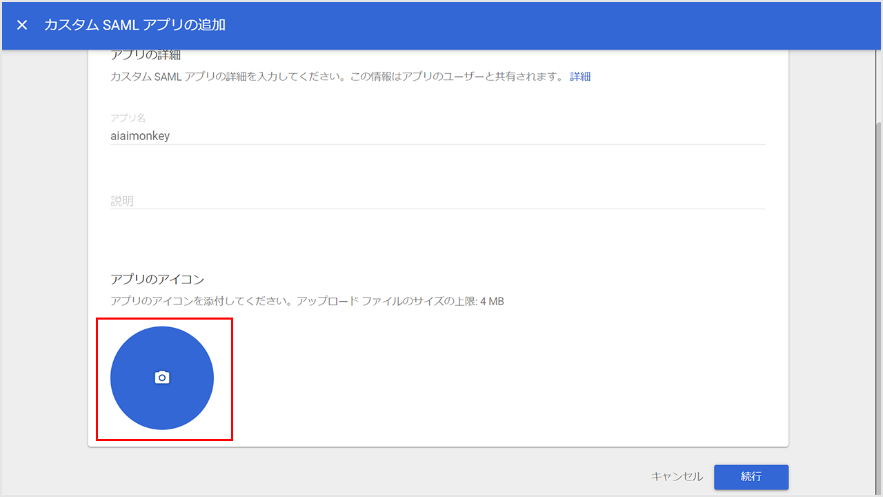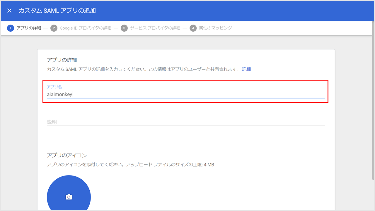 ②「アプリのアイコン」の青い丸をクリックして、「AIAIモンキー」の画像を選びます。(スキップ可)
