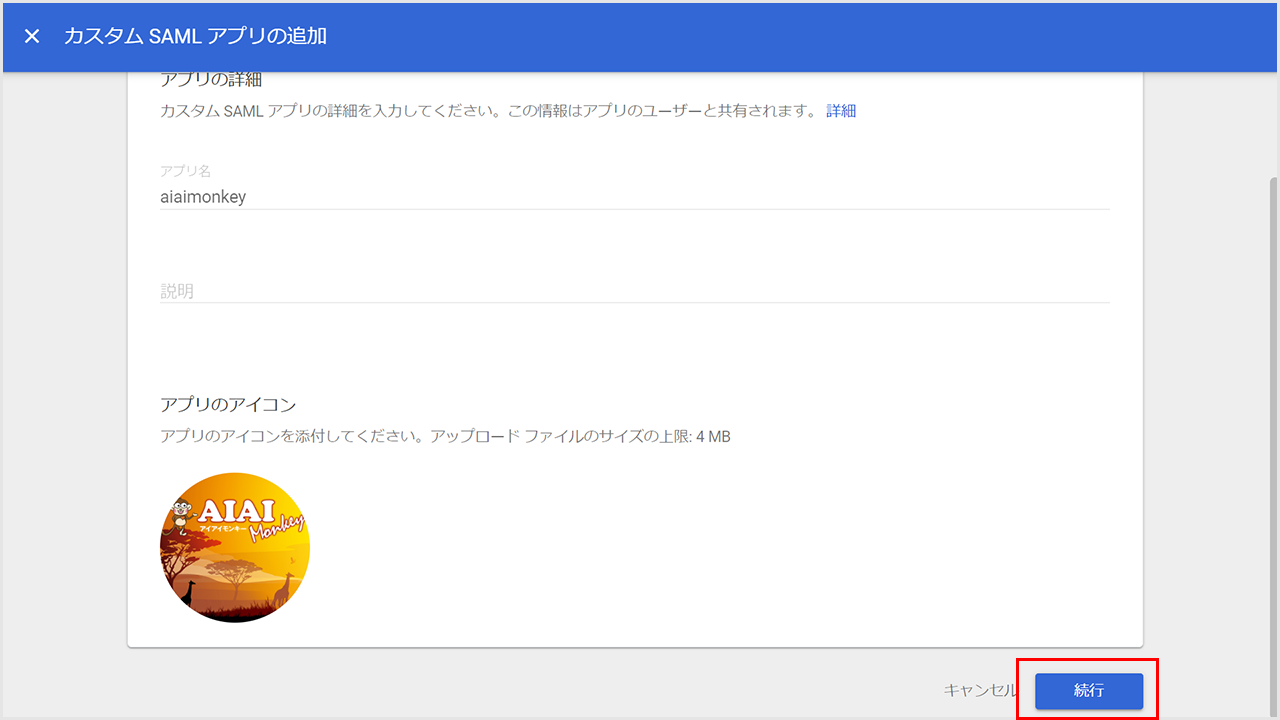 ③アプリ名とアイコンの設定が完了したら、「続行」をクリックします。
