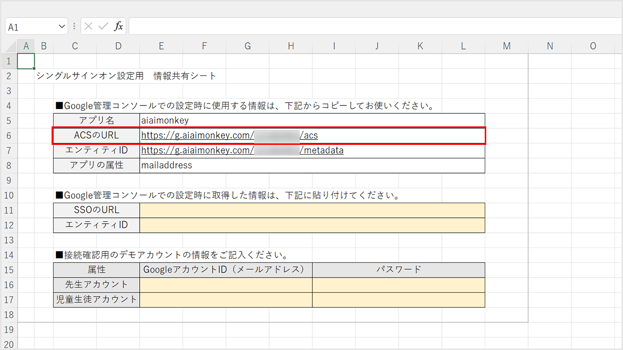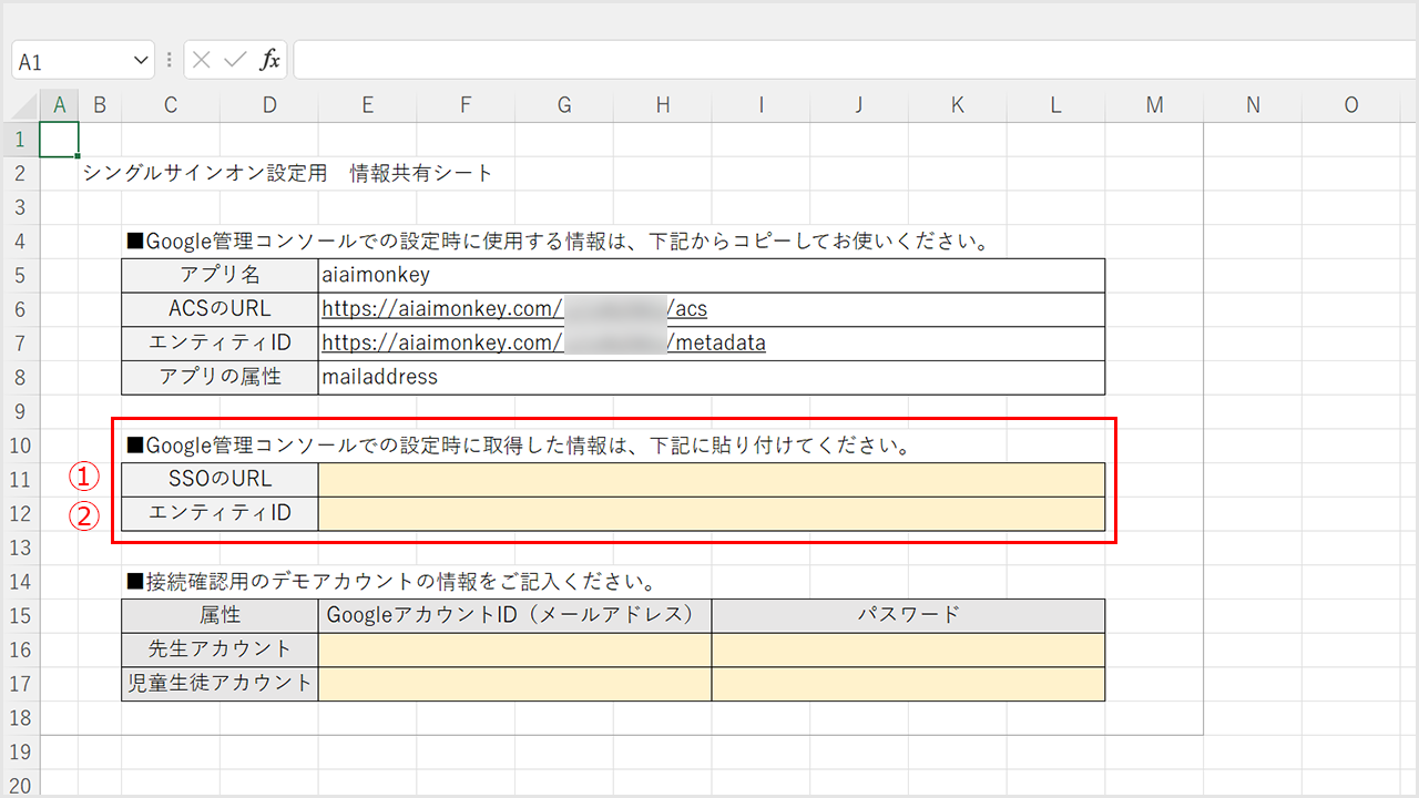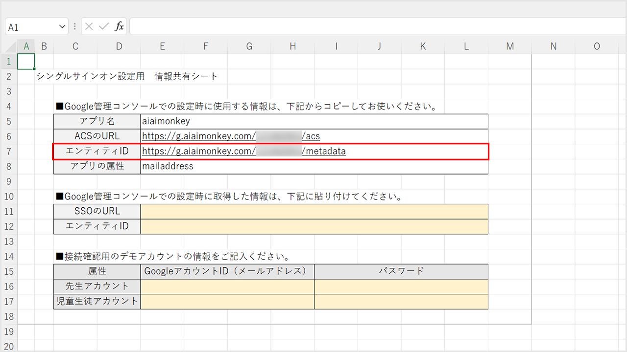 ②コピーした「SSOのURL」と「エンティティID」を情報共有シートに貼り付けてください。