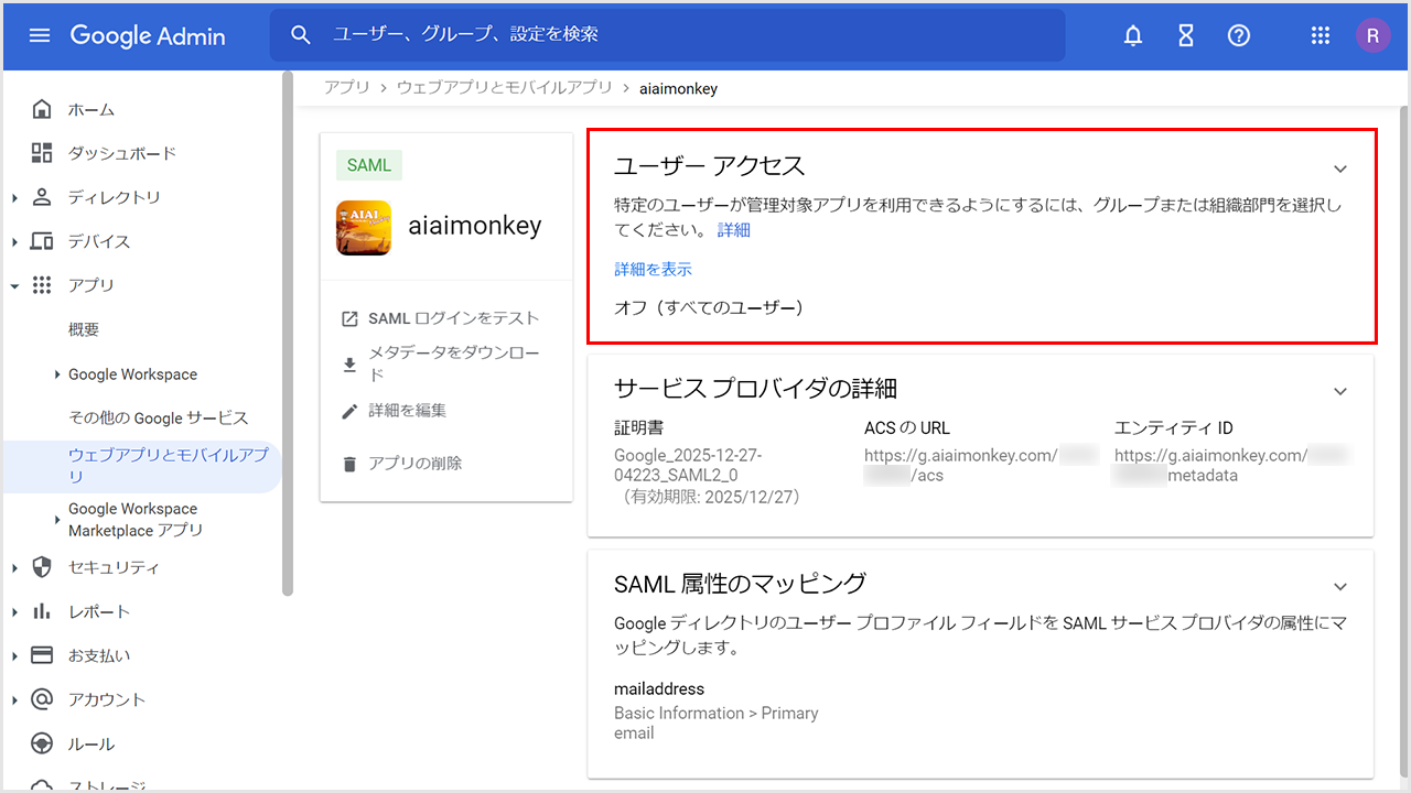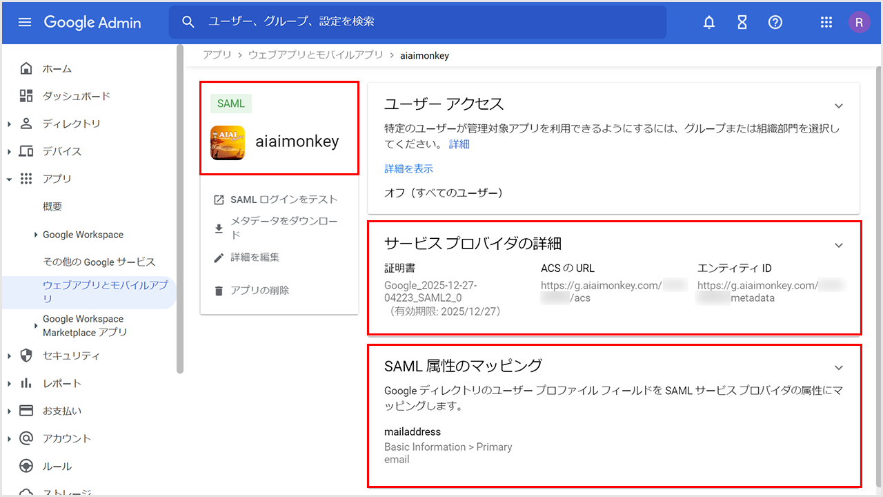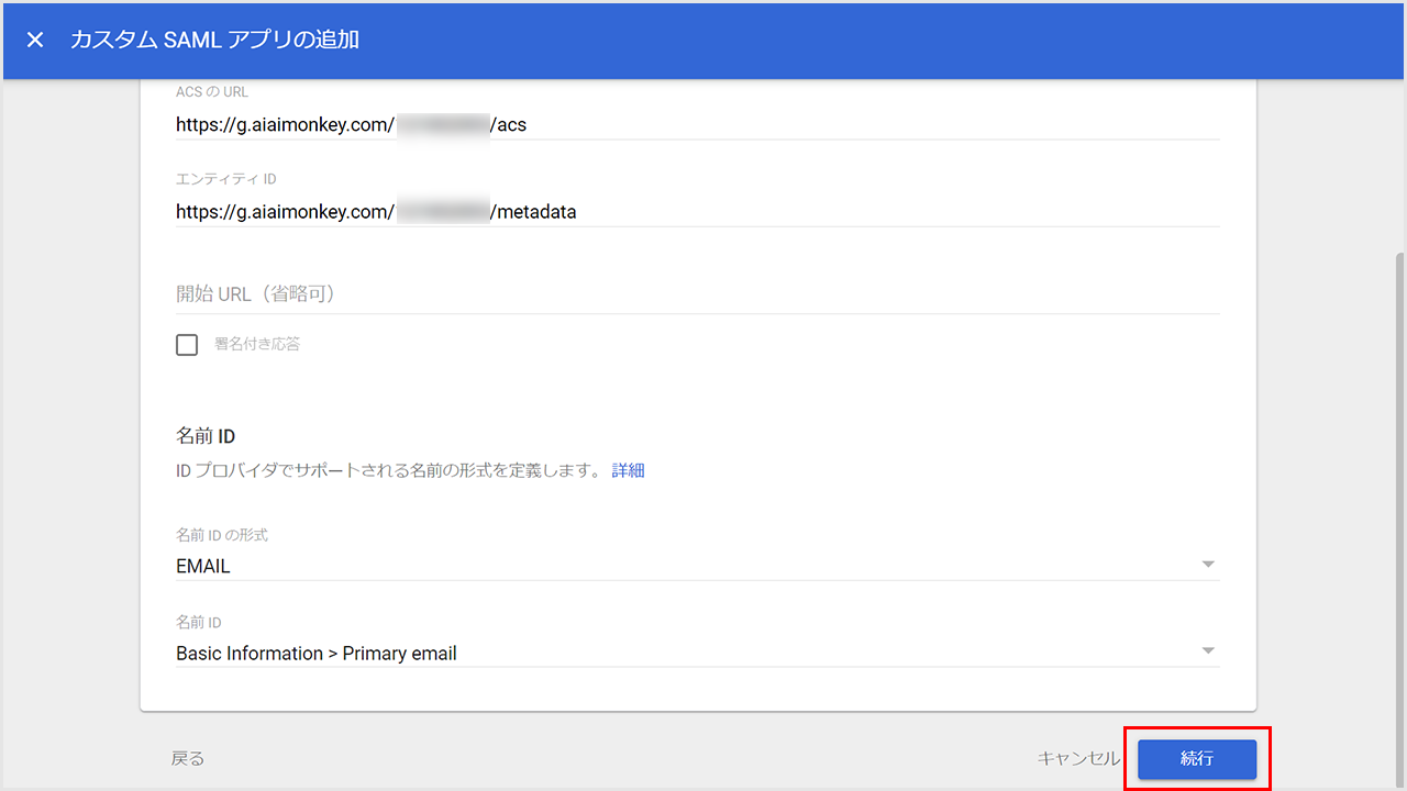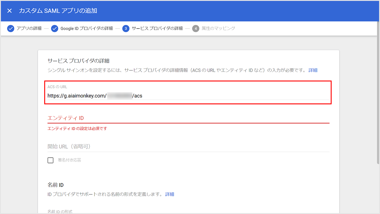 ②「ACSのURL」に「https://g.aiaimonkey.com/設定コード/acs」を貼り付けます。