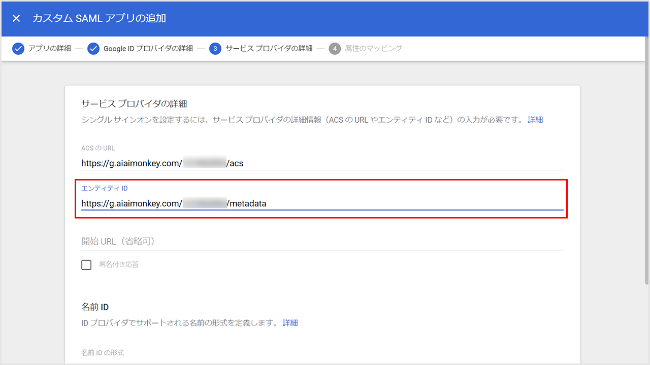 ④「エンティティID」に「https://g.aiaimonkey.com/設定コード/metadata」を貼り付けます。