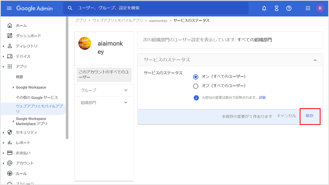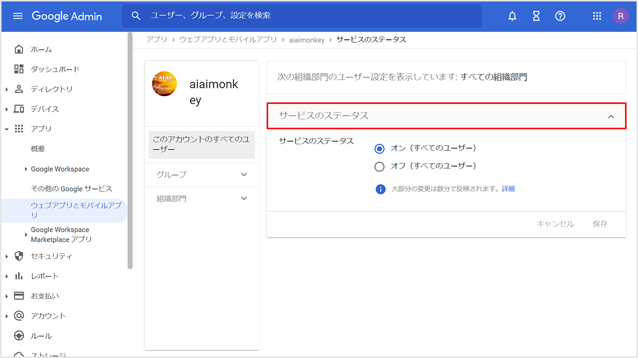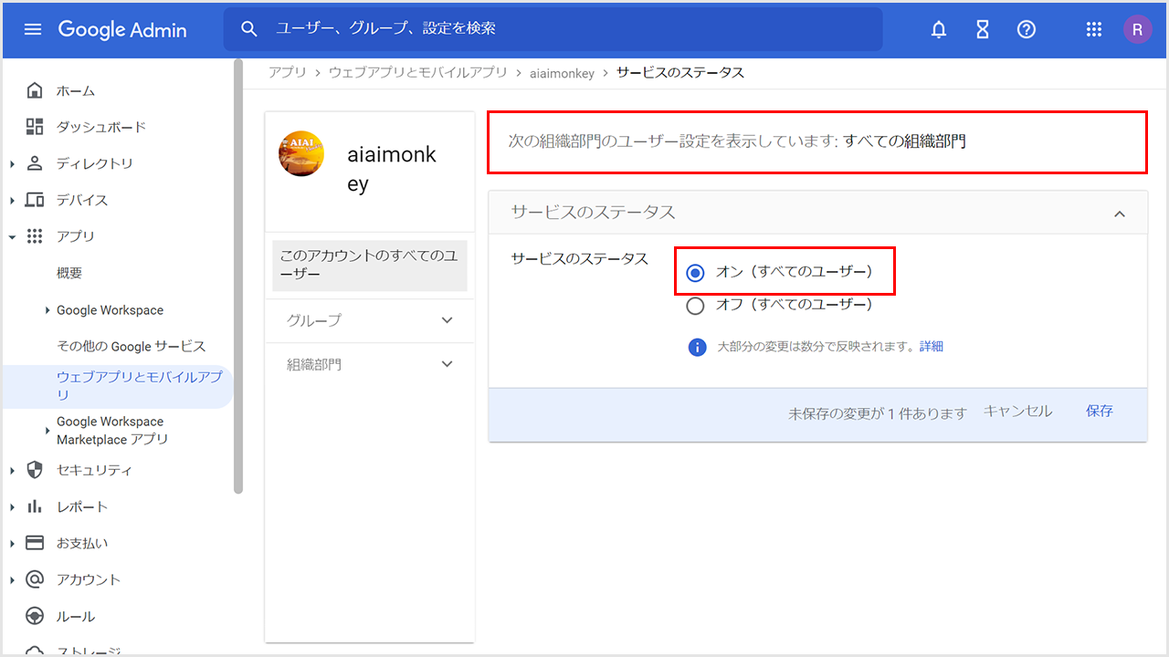 ②対象が「すべての組織部門」になっていることを確認し、「オン(すべてのユーザー)」をクリックします。