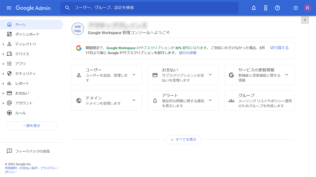 ①設定する自治体、または学校のGoogle管理コンソールにログインします。